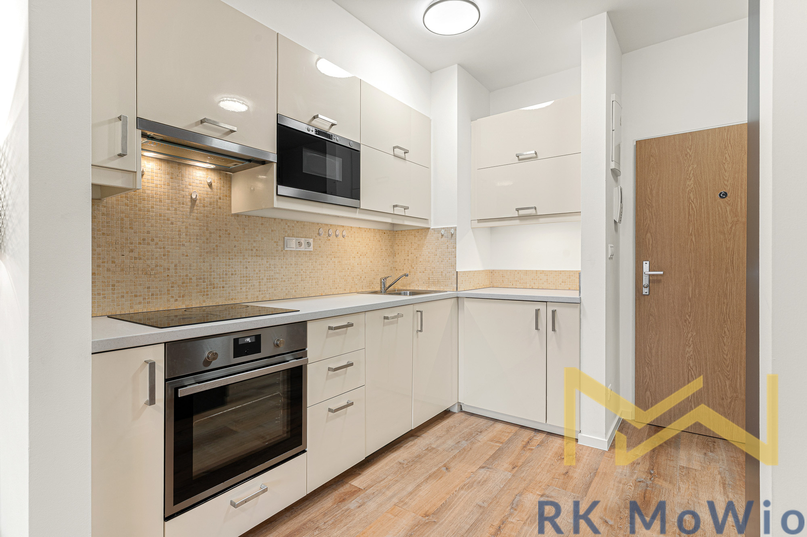 The layout of the apartment unit features an entrance hall, a living room with a kitchenette and dining area with terrace access, a bedroom also with terrace access, and 1 bathroom (with bathtub, washbasin, and toilet). Apartment equipment: kitchen unit (including fridge-freezer, glass-ceramic hob, hood, dishwasher, and electric oven), built-in wardrobes, washing machine and dryer, and high-speed internet preparation. A parking space is included with the apartment.