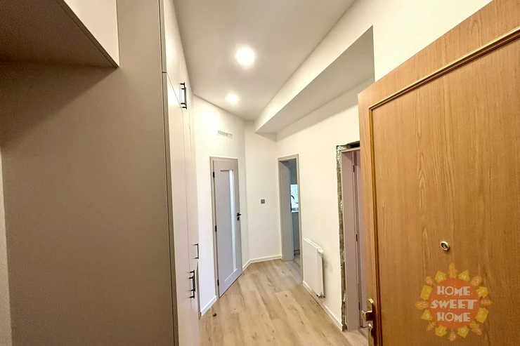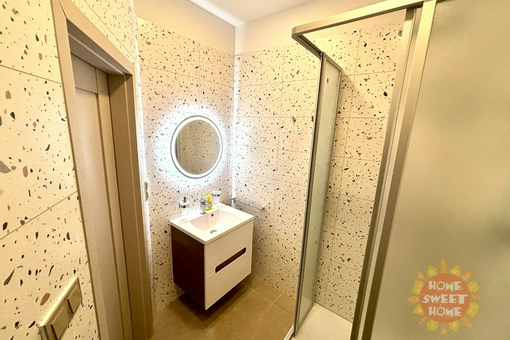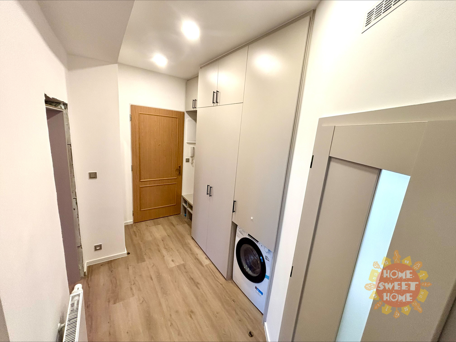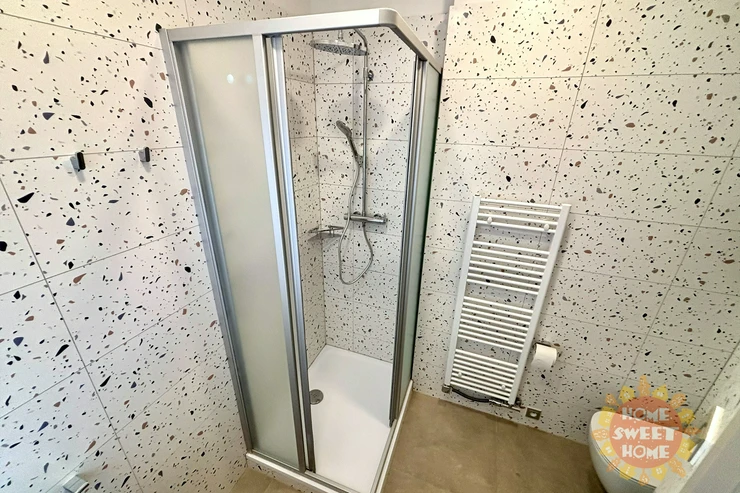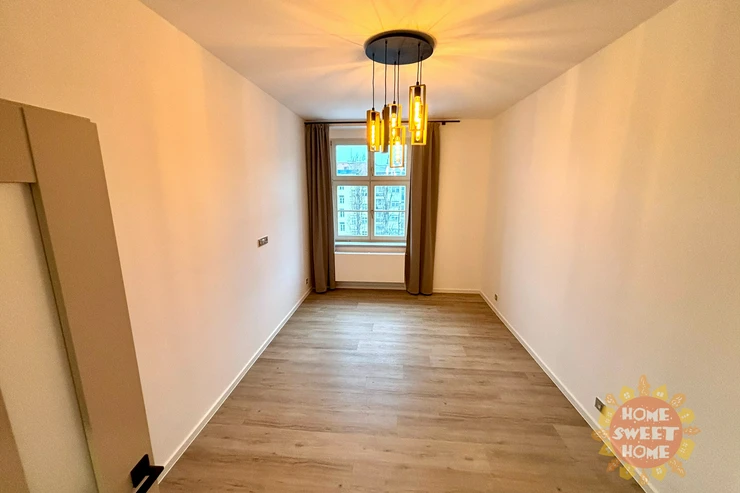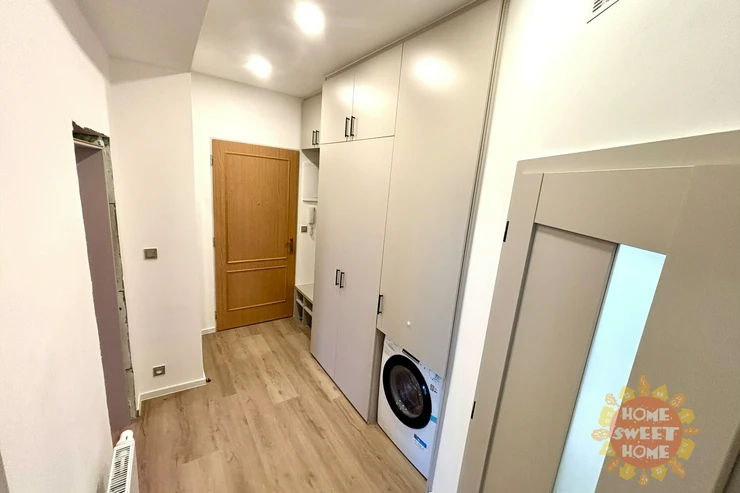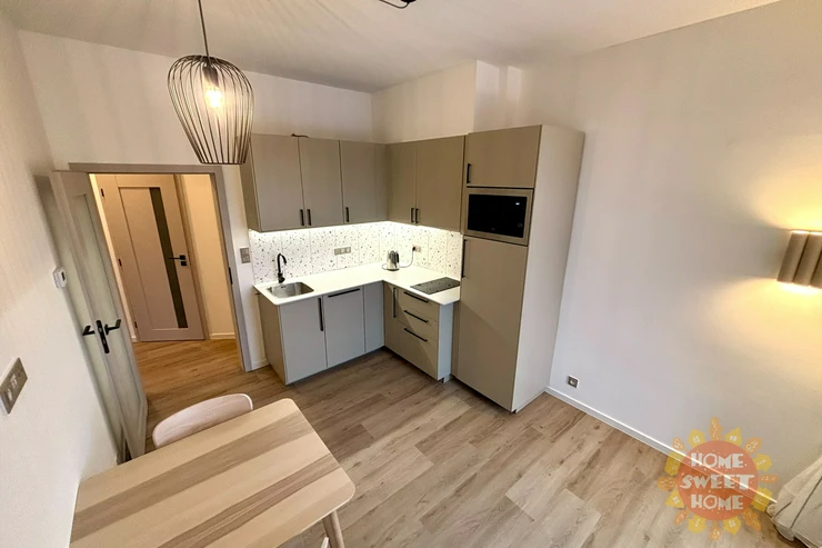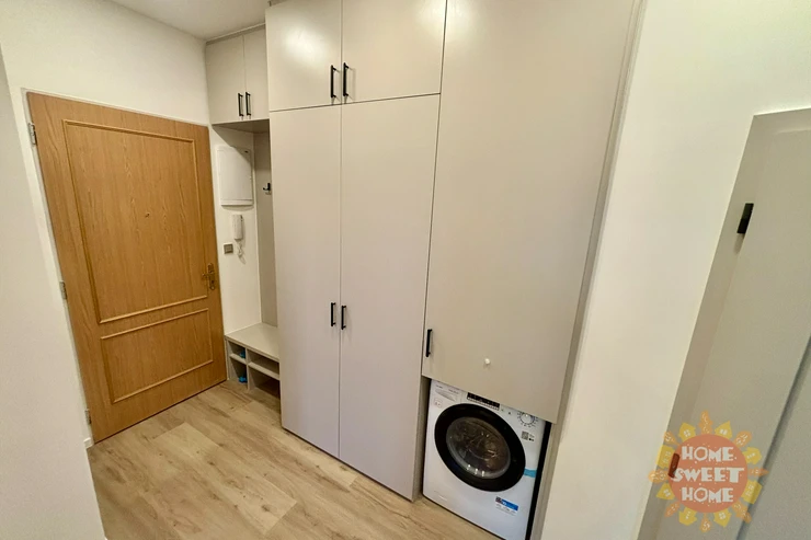 The interior of the apartment is partially furnished and provides comfortable living. The kitchen area is equipped with a multifunctional microwave oven with grill, narrow dishwasher, refrigerator with freezer, extractor hood, and two-burner induction hob on a composite board. The floor is covered with vinyl flooring, which gives the space a modern and cozy look. The bathroom has a shower, sink, and toilet. Water heating and heating are provided by a condensing boiler. The hallway of the apartment is equipped with a built-in wardrobe and washing machine with dryer, which contributes to maximum use of space and comfortable living. The apartment also has a storage room that can be used for food storage or as a cleaning room. Internet connection is provided by O2.