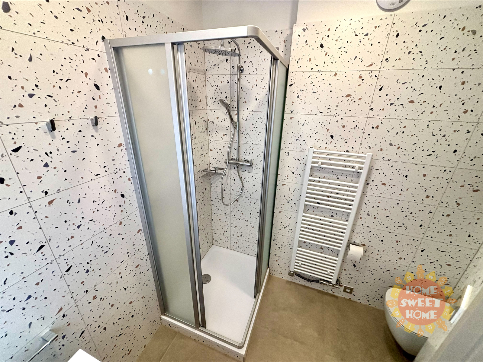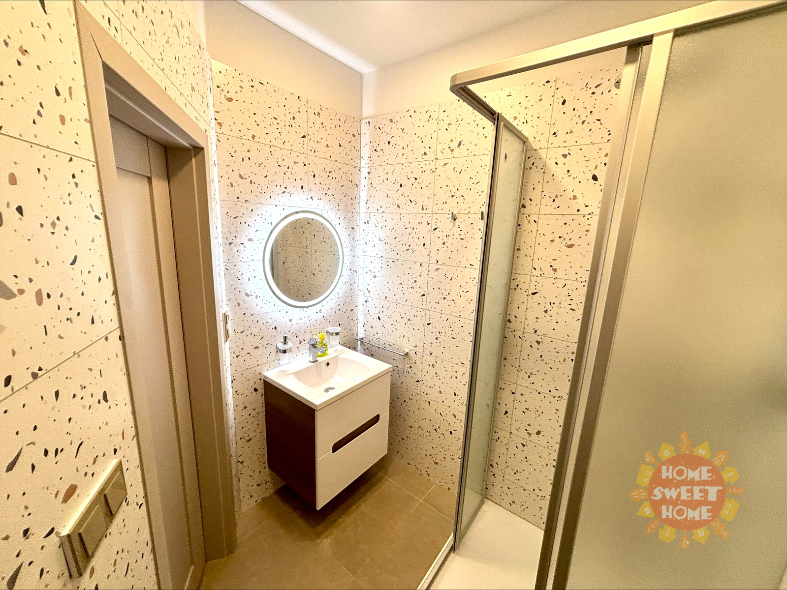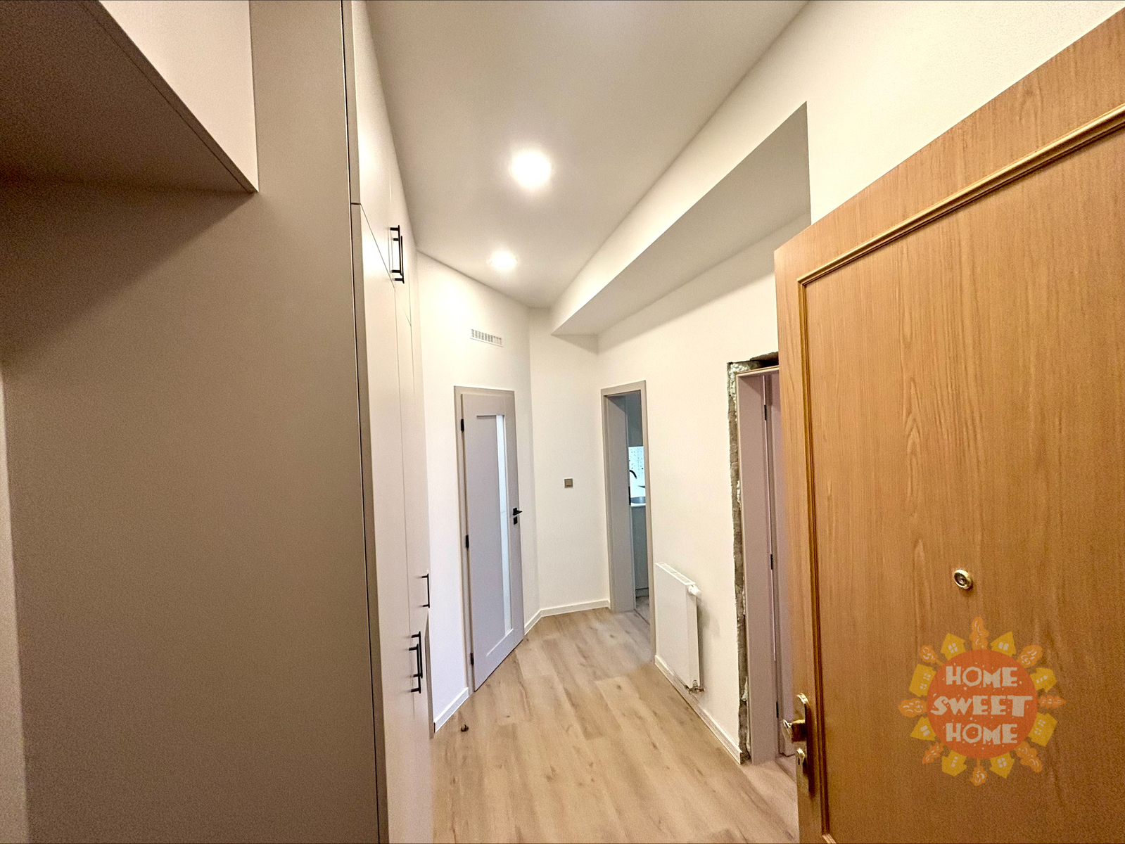 The interior of the apartment is partially furnished and provides comfortable living. The kitchen area is equipped with a multifunctional microwave oven with grill, narrow dishwasher, refrigerator with freezer, extractor hood, and two-burner induction hob on a composite board. The floor is covered with vinyl flooring, which gives the space a modern and cozy look. The bathroom has a shower, sink, and toilet. Water heating and heating are provided by a condensing boiler. The hallway of the apartment is equipped with a built-in wardrobe and washing machine with dryer, which contributes to maximum use of space and comfortable living. The apartment also has a storage room that can be used for food storage or as a cleaning room. Internet connection is provided by O2.