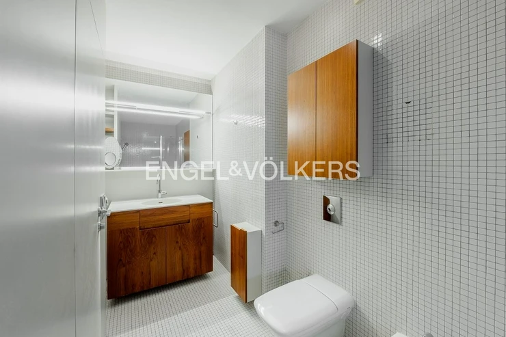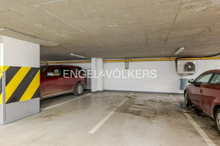 The interior is dominated by a bright living room with a fully equipped kitchen and access to the balcony. The master bedroom has a walk-in closet and its own en-suite bathroom with a shower. The other three bedrooms are located in the quiet part of the apartment, one of which has its own balcony. The second bathroom is equipped with a bathtub, bidet, and toilet.