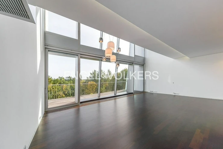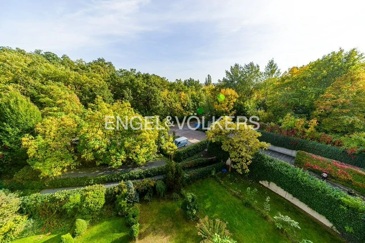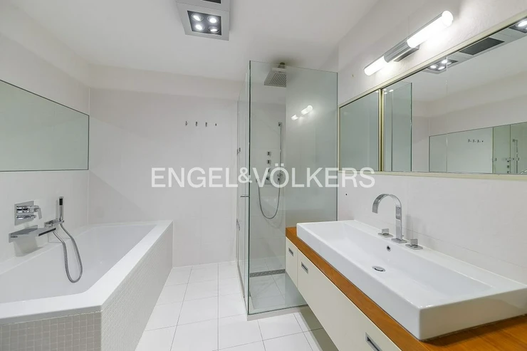 The location boasts proximity to international schools, the airport, and recreational amenities, including a pool, sauna, gym, children's playground, and even a squash court. The apartment includes a spacious cellar and two garage parking spots. Monthly service fees are based on actual consumption with an estimated advance of approximately 30 000 CZK.
