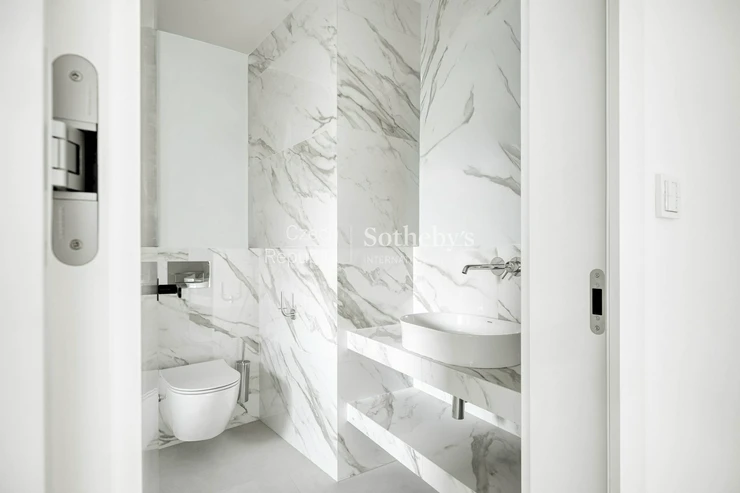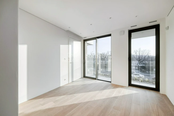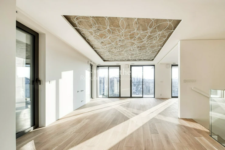 The interior of the apartment meets the high standard of the entire project. Large-format aluminum windows with triple-glazed insulating glass bring plenty of daylight into the interior and emphasize the airiness of the space. The standard includes three-layer wooden floors, bathrooms with tiles and sanitary elements from the Porcelanosa brand, and raised ceilings with integrated indirect LED lighting.
