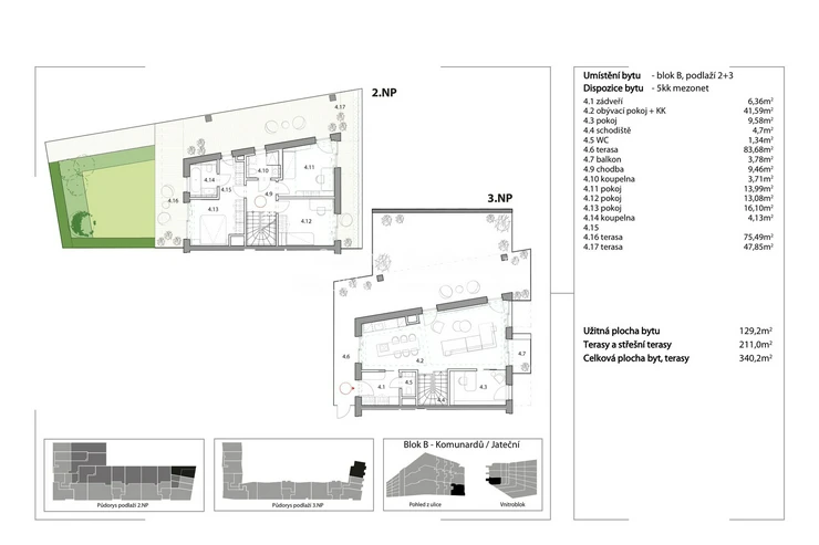 An internal staircase leads down to the 2nd floor, where the quiet part of the apartment is located. It includes three separate bedrooms, two bathrooms and a front garden. The layout is designed with an emphasis on functionality, sufficient privacy and flexible use of individual rooms.