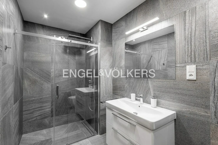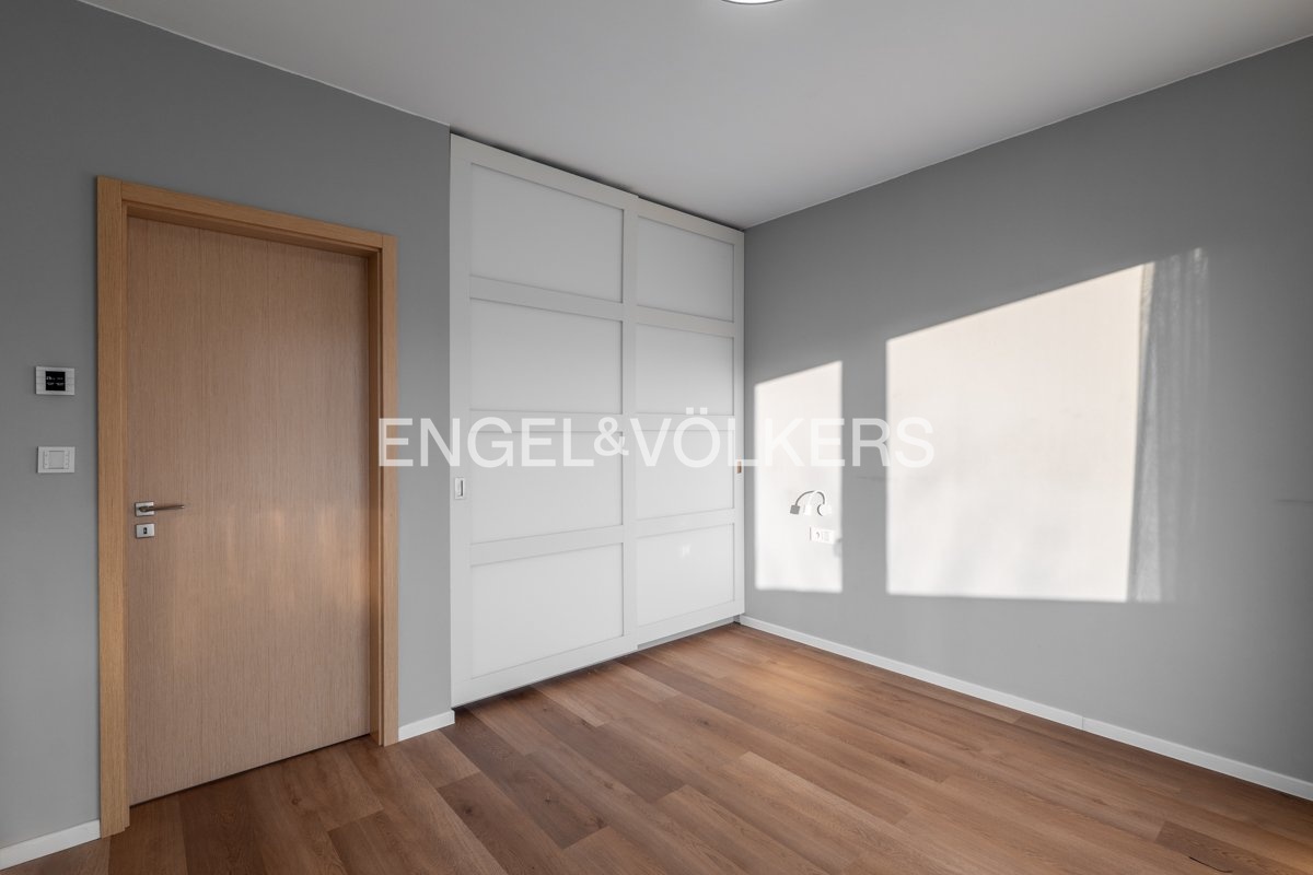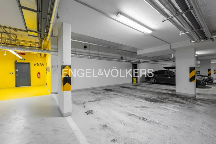 The apartment comes with a large cellar and a garage parking space. The apartment features wooden floors, window blinds, and smart lighting throughout.