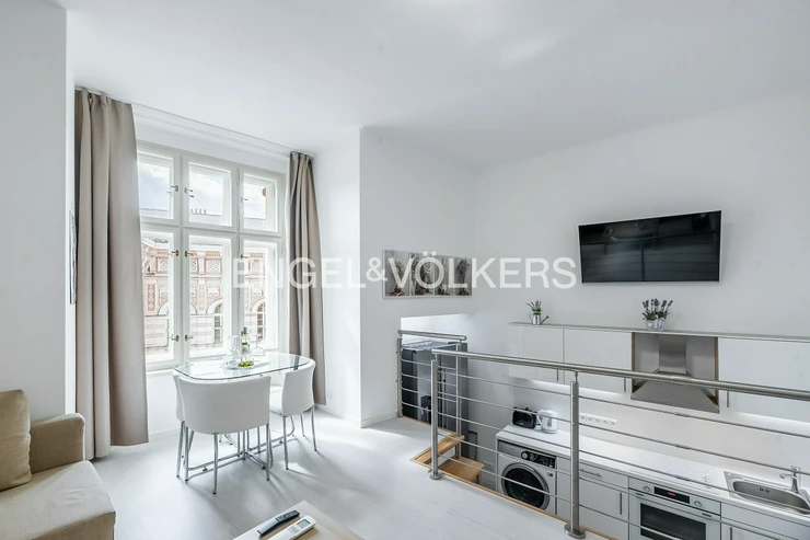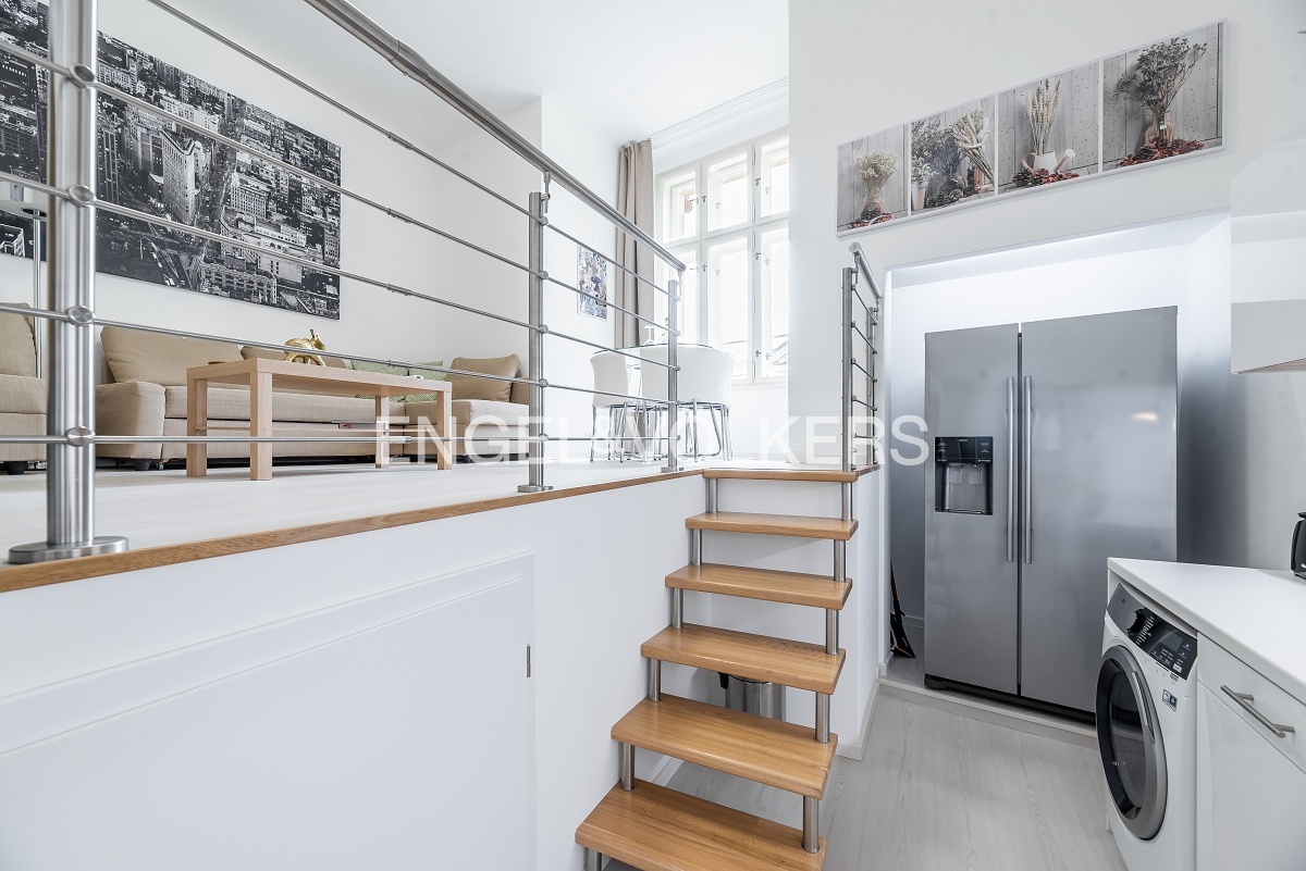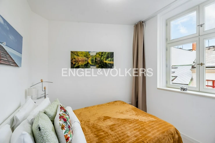 The kitchen offers plenty of workspace and is equipped with all appliances, including a double-door refrigerator, stove, oven, dishwasher, and washing machine. The living room adjoining the kitchen is beautifully bright with a view of Vodičkova Street. The bedroom faces a quiet courtyard. The bathroom has a shower.