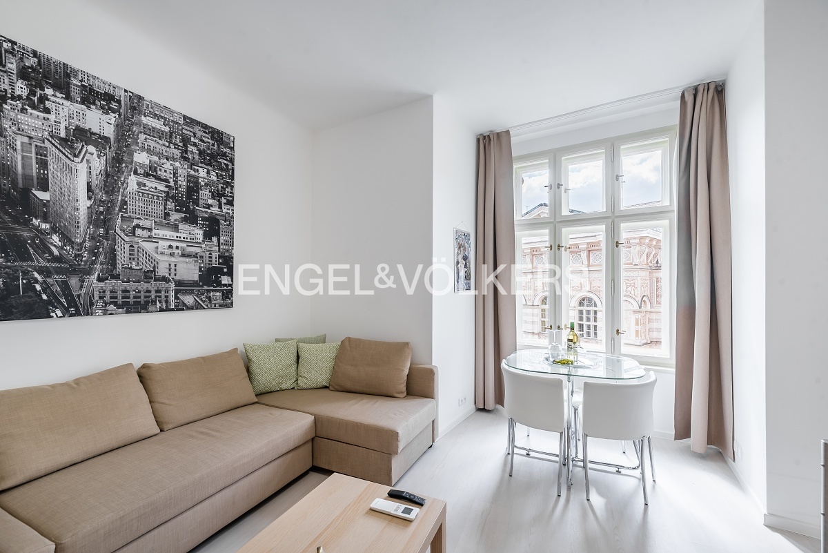 We offer a beautiful, bright apartment for long-term rent in the very centre of Prague. The unit is located on the 4th floor of a well-maintained apartment building without an elevator and is offered fully furnished.