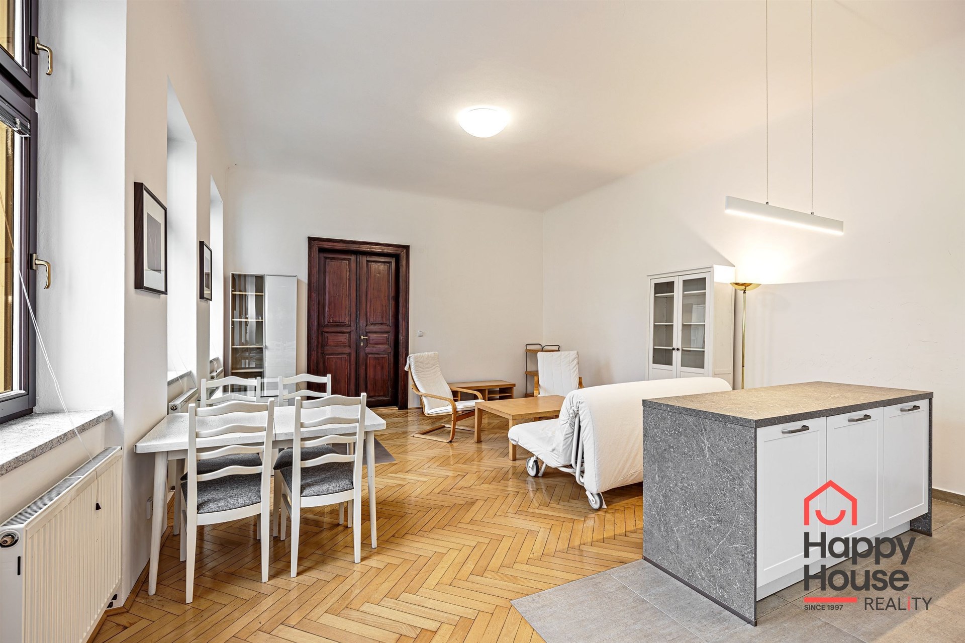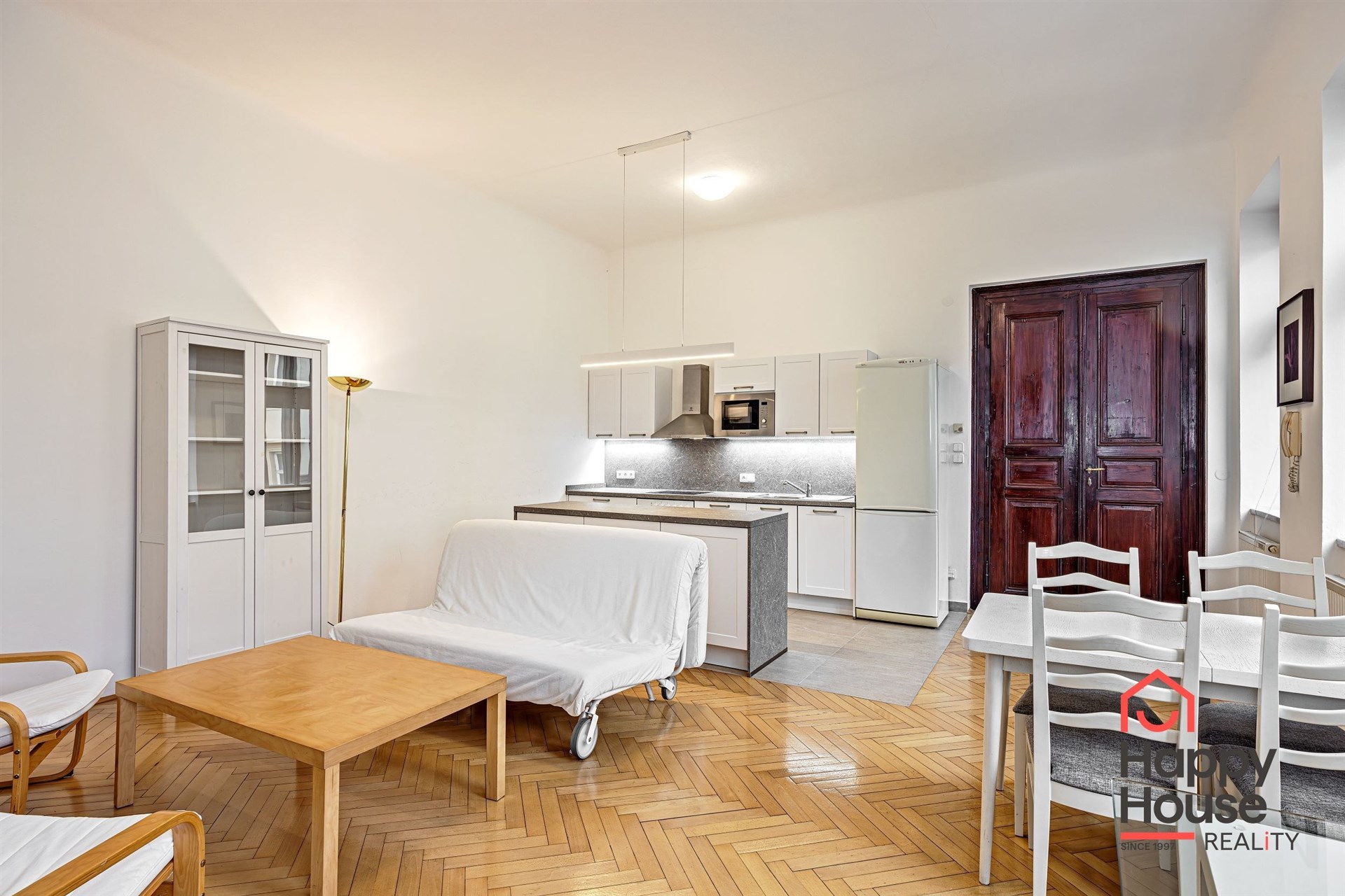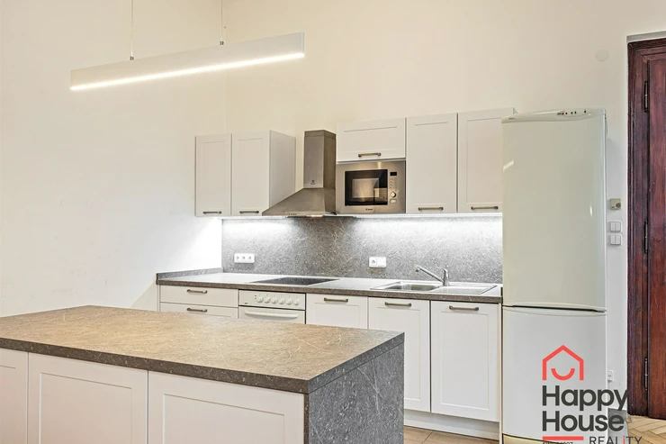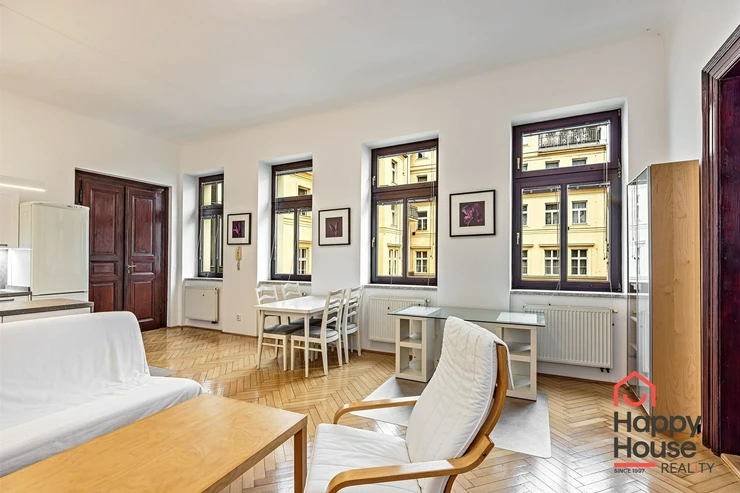 Bright, spacious one-bedroom apartment on the 3rd floor of a brick building with an elevator in the sought-after area of Prague 1 - Nové Město. The house, built in 1878, has been reconstructed and is characterized by many original historical features - high ceilings, wooden parquet floors, stucco decoration - combined with the most modern construction technologies and equipment - elevator, satellite reception, cable TV, three telecom service providers, possibility of optical cable connection. The apartment is unfurnished and offers an entrance hall (3.79 sqm), a living room with a new kitchenette (37.95 sqm), a bedroom (19.41 sqm), a bathroom (4.68 sqm), and a winter garden (4.93 sqm). The kitchenette is equipped with a kitchen unit, refrigerator with freezer, ceramic hob, electric oven, and dishwasher. The bathroom has a bathtub, toilet, washing machine, and gas boiler. Parquet floors, tiles. It is possible to rent a garage parking space in the basement for CZK 3.800 to 5.800 + VAT/month depending on the size of the car.