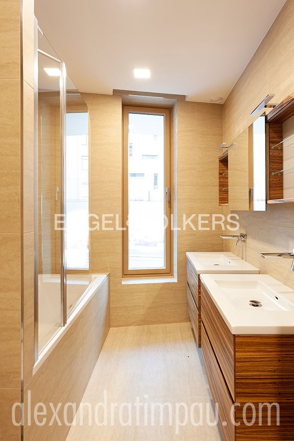 The dominant feature of the apartment is a bright living room connected to a kitchen equipped with high-quality appliances, with access to a 19.9 m² terrace. The apartment has two bedrooms, one of which is unfurnished.