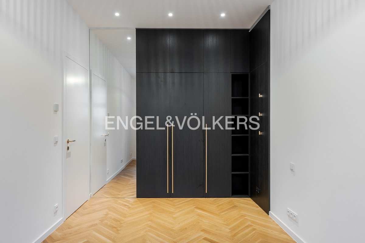 The apartment offers a well-thought-out layout suitable for either a couple or a family. The interior is dominated by a living room with a kitchenette fully equipped with high-quality appliances. A pleasant advantage is the direct access from the living room to the balcony facing a quiet courtyard with greenery. There are also two separate bedrooms with practical built-in wardrobes, a bathroom with a shower, a separate toilet, a spacious dressing room, and an entrance hall. Comfortable living is enhanced by the use of high-quality materials and the possibility of using the basement space.
