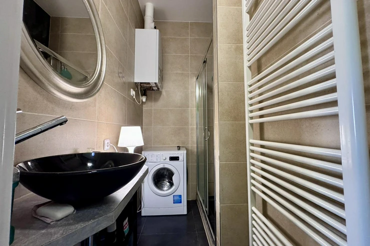 Layout: separate bedroom, living room, kitchen, bathroom with shower, separate toilet, and a practical storage room. The apartment is fully equipped with furniture, a dishwasher, washing machine, microwave, gas boiler, and more.