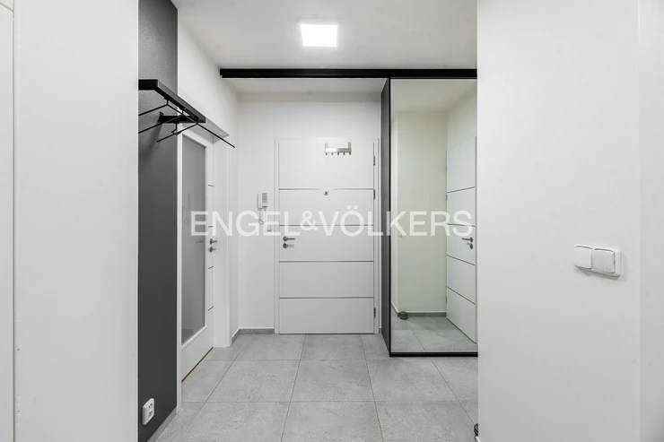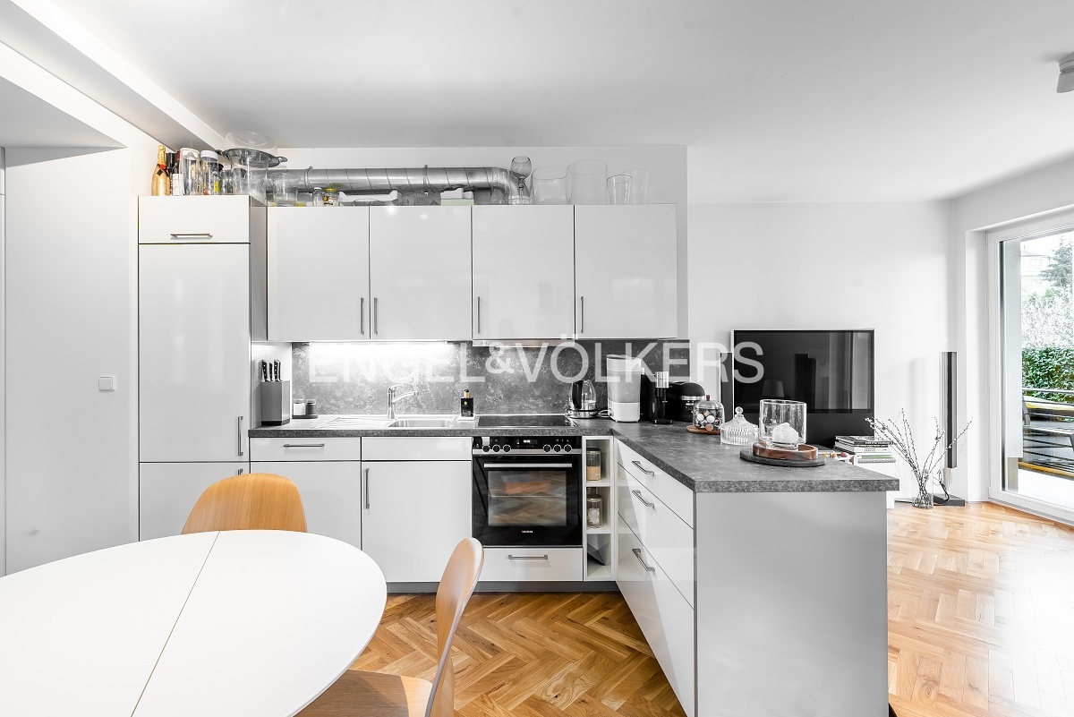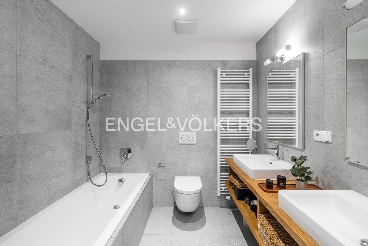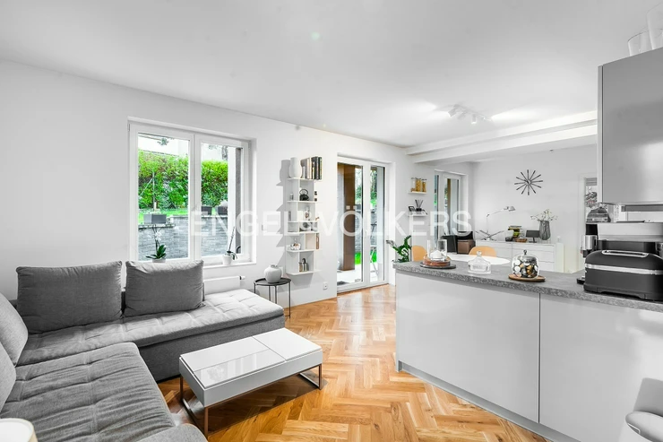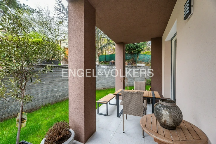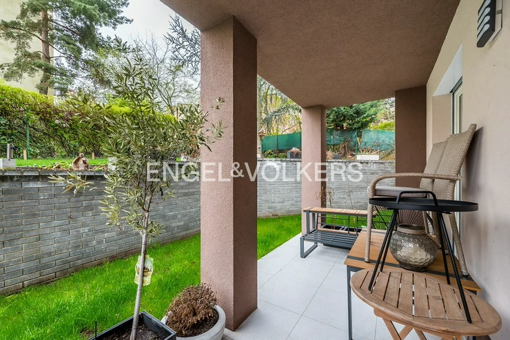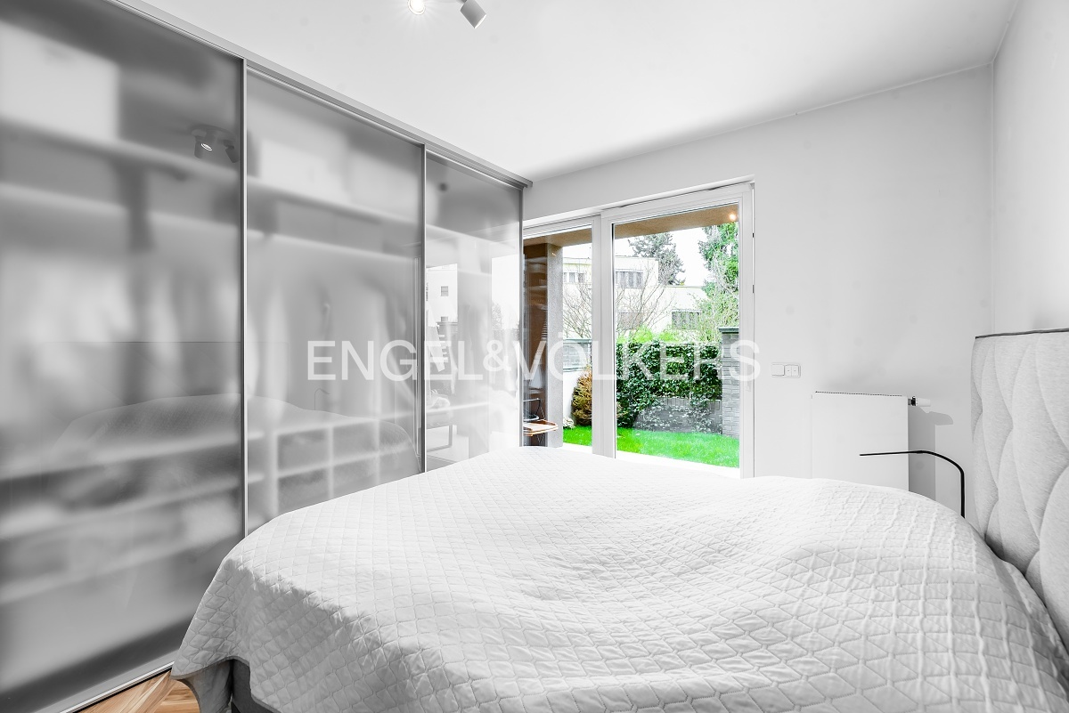 All rooms are very bright and airy thanks to French windows. The living room provides access to a terrace, which leads to a private, generous garden with an area of 300 sqm. The spacious kitchenette is equipped with all high-end appliances. The master bedroom features a built-in wardrobe and also offers access to the terrace. There are two very high-standard bathrooms in the apartment; the larger one is equipped with a bathtub and the second with a shower.