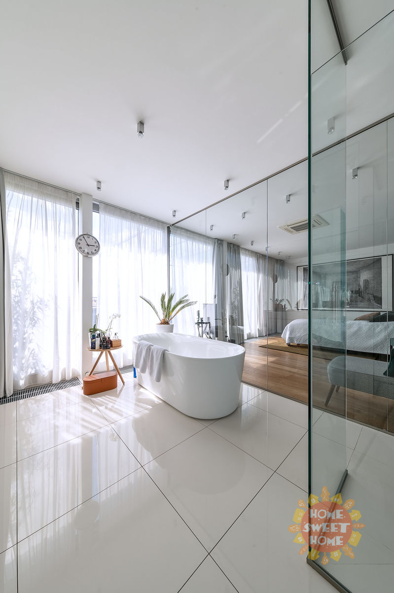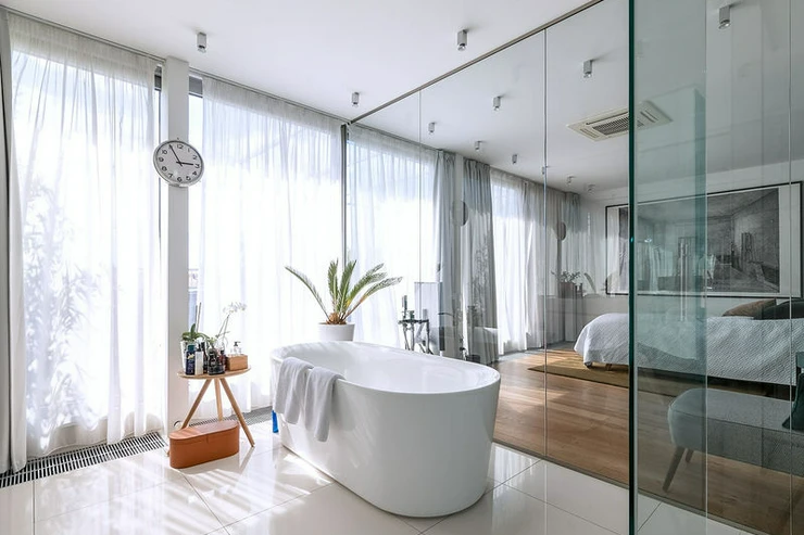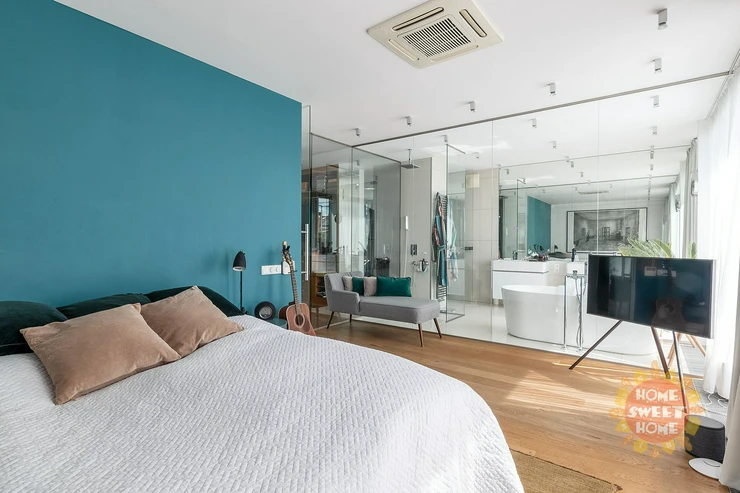 On the 7th floor there is a master bedroom with a dressing room and a bathroom (bath and shower), two more bedrooms, a bathroom with a shower, and an entrance to the terrace (80 sqm). The dominant feature is the roof terrace of 89 sqm. Plenty of storage space - a dressing room and built-in wardrobes. The apartment uses quality materials, oak parquet floors, designer tiles, a gas boiler, security doors. A washer/dryer is available.