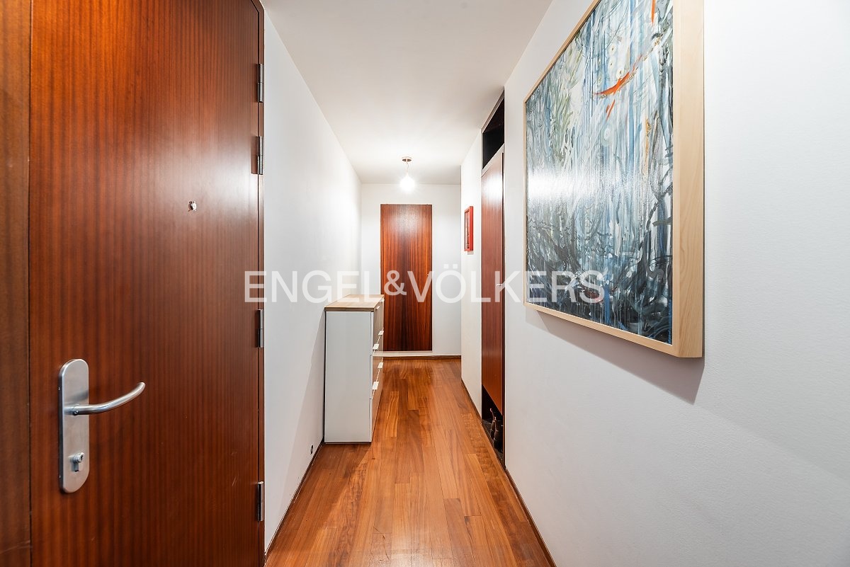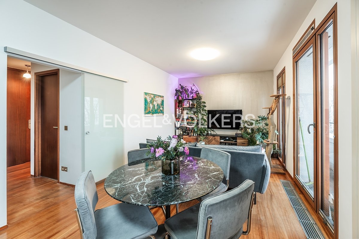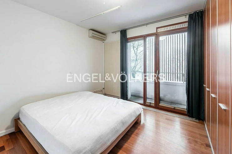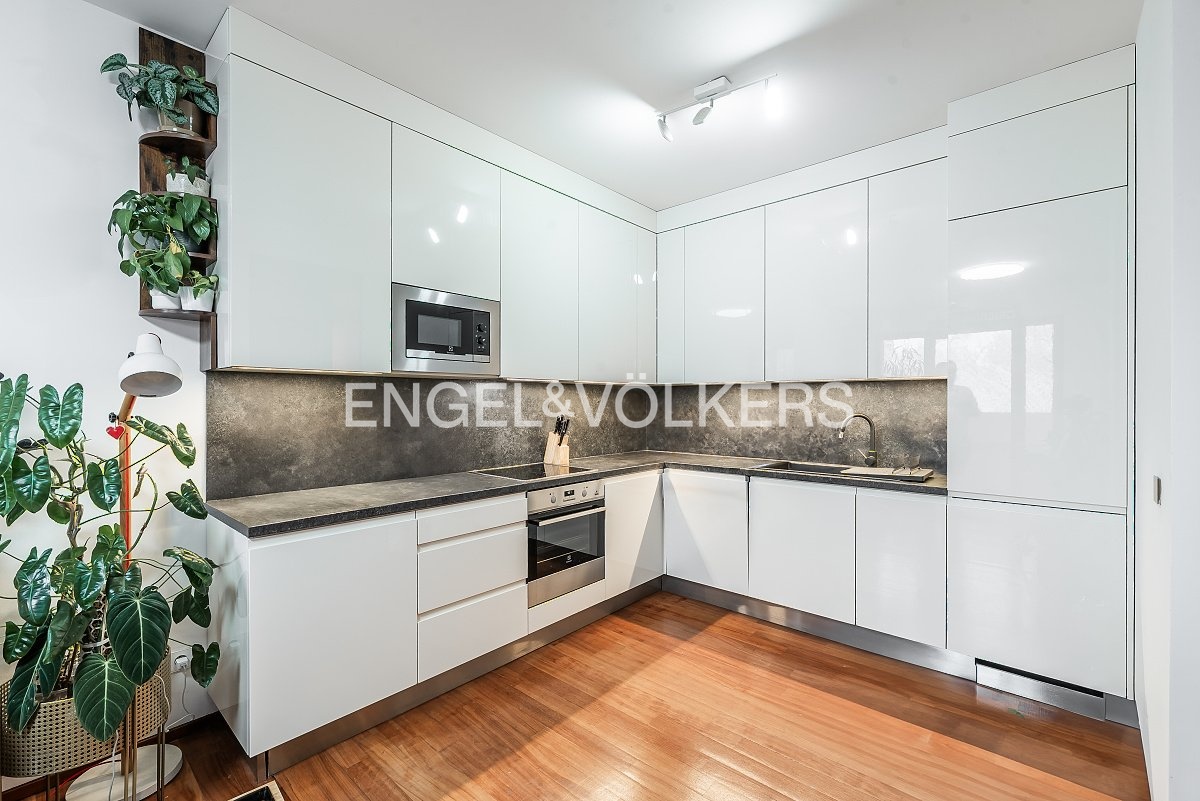 The apartment offers above-standard finishes - high-quality wooden floors and tiles, built-in wardrobes in the bedroom and hall, pleated blinds, and plenty of storage space. The kitchen is equipped with a dishwasher, induction hob, and microwave. The apartment also has a cellar.