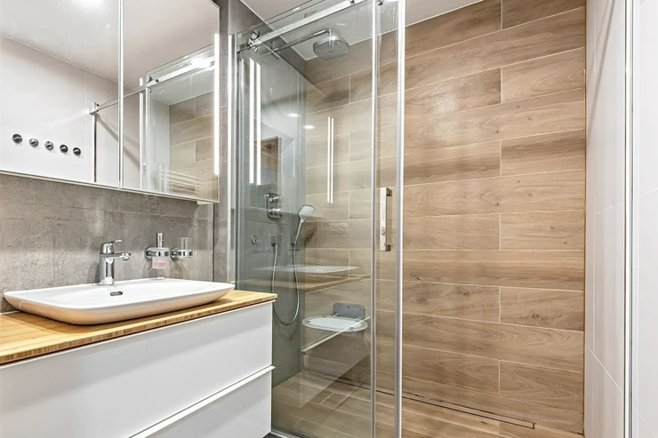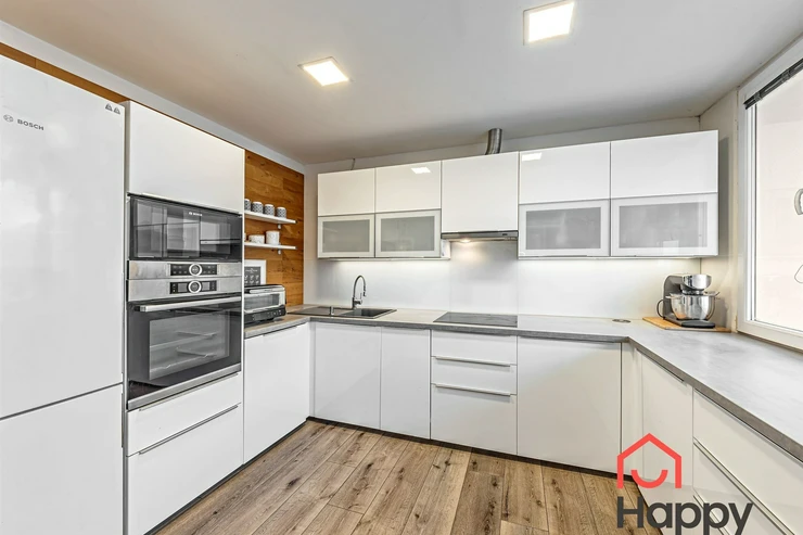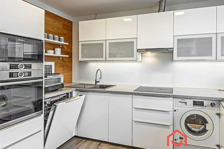 The kitchen is equipped with a modern unit with built-in appliances – induction hob, extractor hood, electric steam oven, microwave oven, dishwasher, and a washer-dryer. The bathroom has a built-in shower. The floors are covered with high-quality vinyl flooring.
