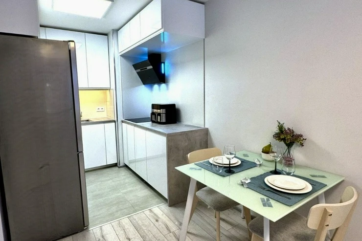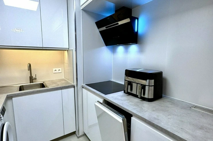 The entrance hall is equipped with a mirrored wardrobe, a coat rack, and a shoe cabinet. The kitchen is fully fitted with appliances, including a refrigerator, dishwasher, range hood, washer-dryer, cooktop, oven, microwave, hot air fryer, dining table, and chairs. The living area features a sofa bed, a coffee table, and a TV stand. The bedroom includes a double bed, bedside tables, a wardrobe, and a chest of drawers. The bathroom is fitted with a bathtub, washbasin, toilet, and a heated towel rail.