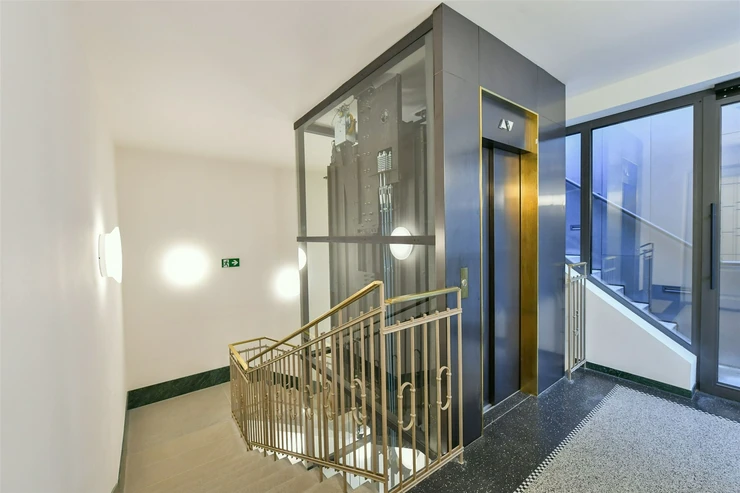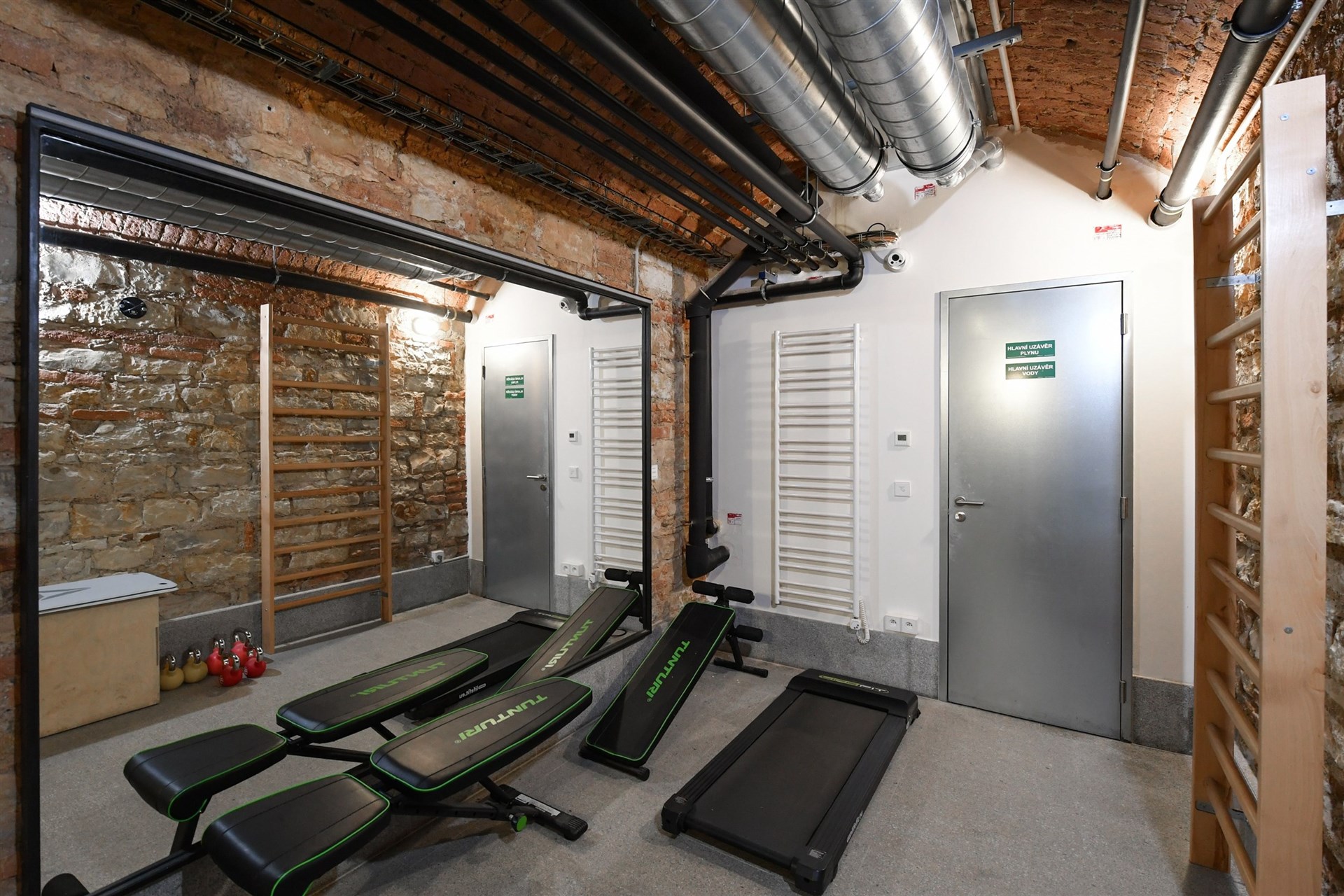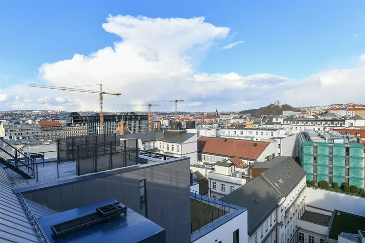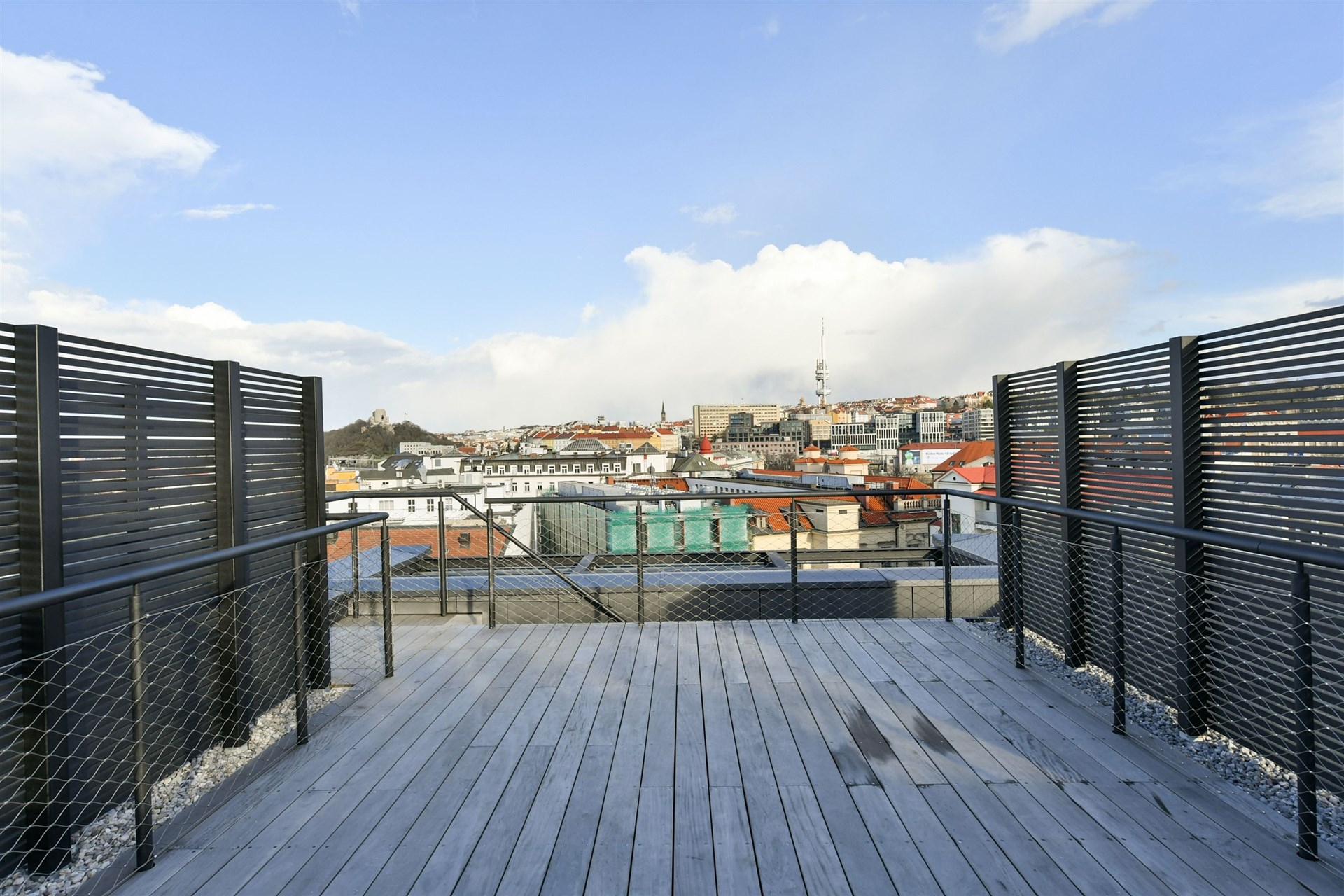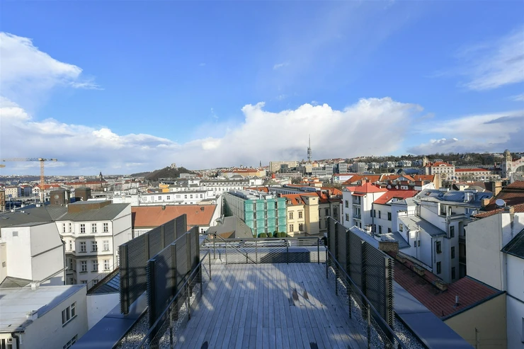 The residential project with a reception, fitness, sauna, elevator, garden, and a communal rooftop terrace with a magnificent view of Prague offers all the comfort to its residents.
