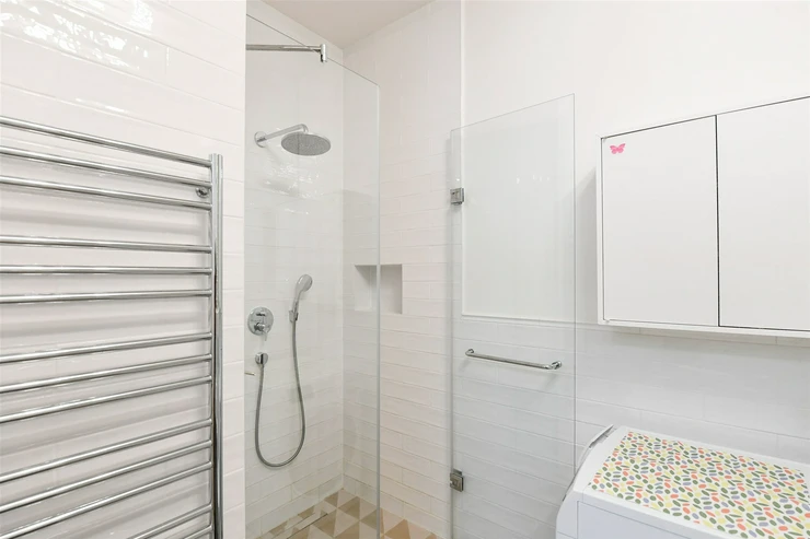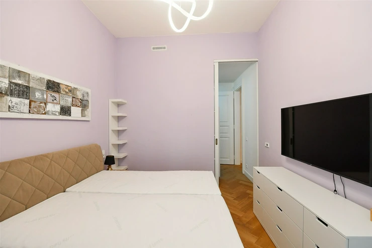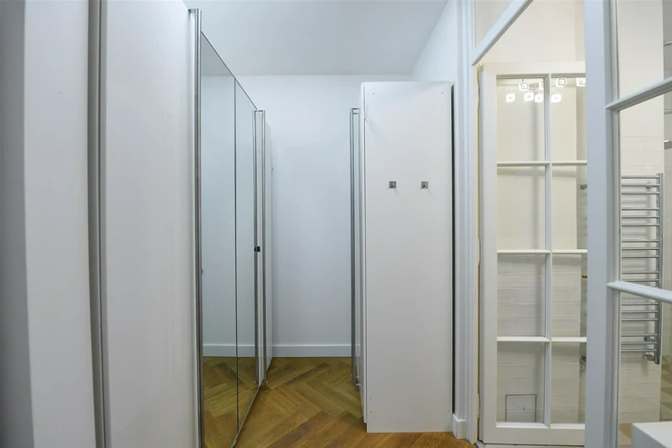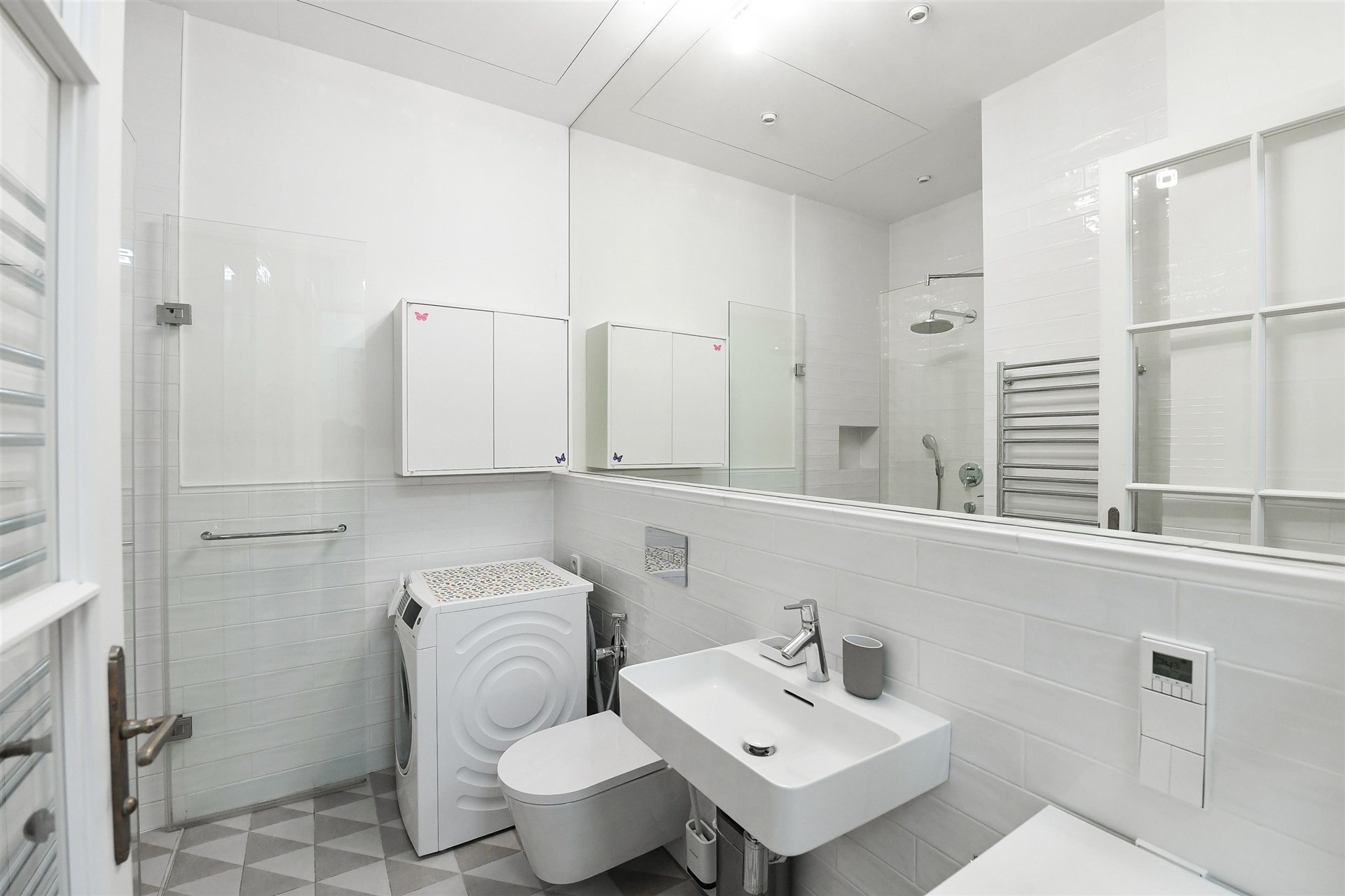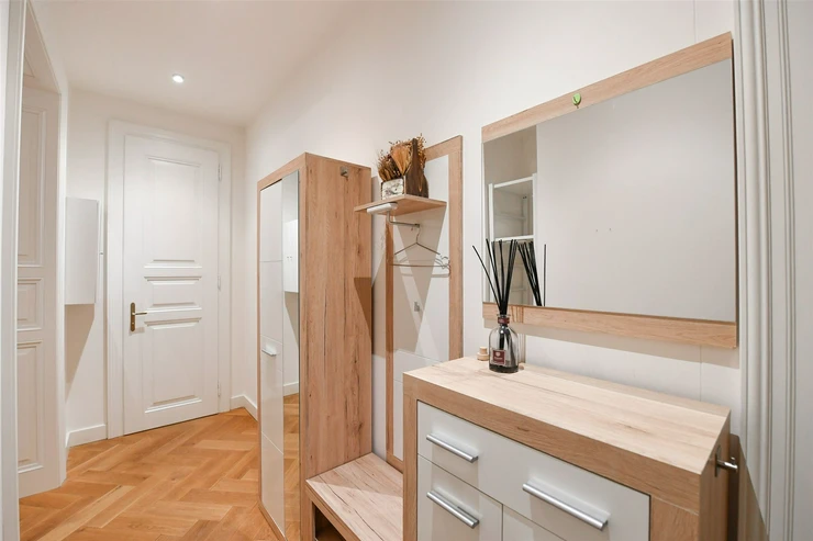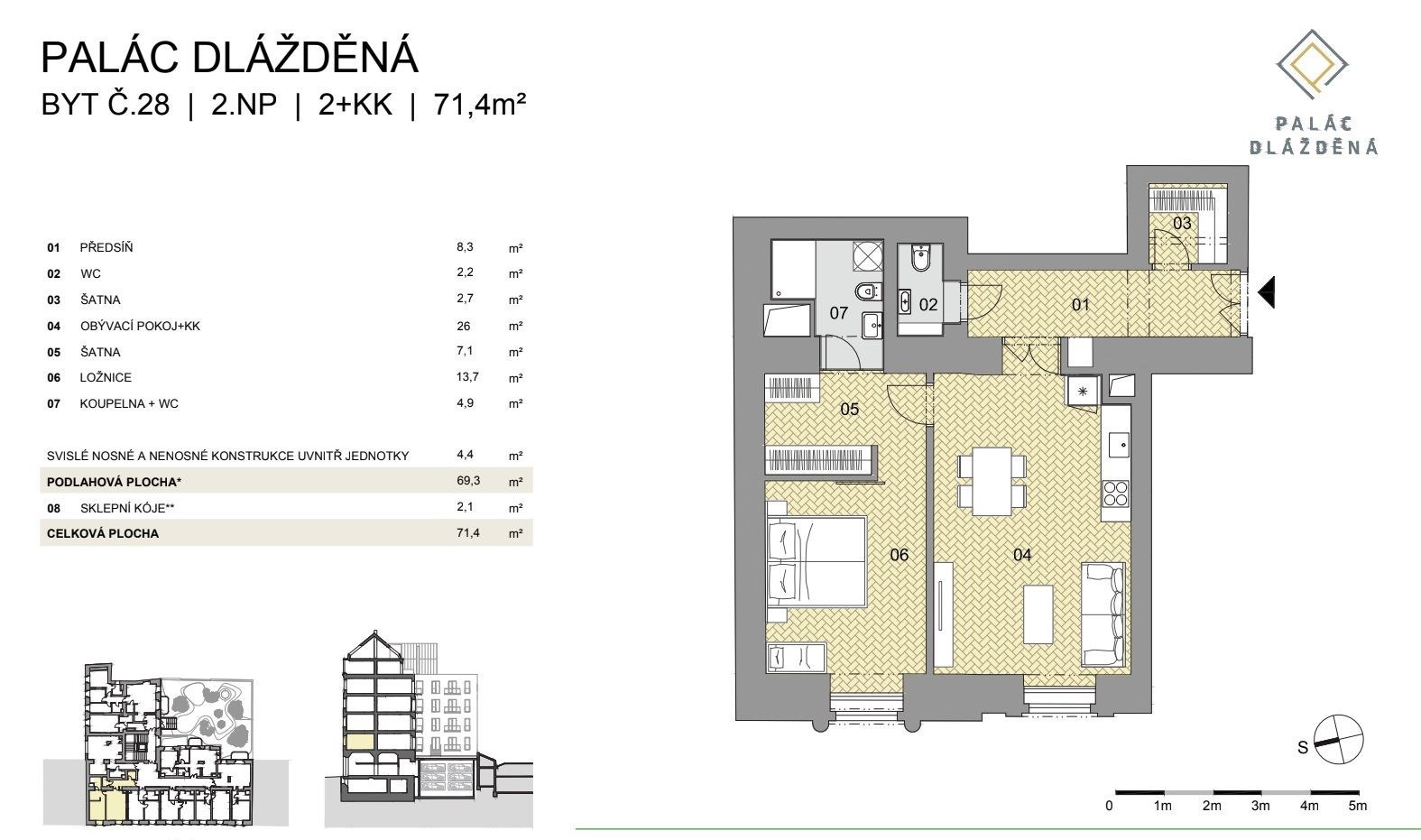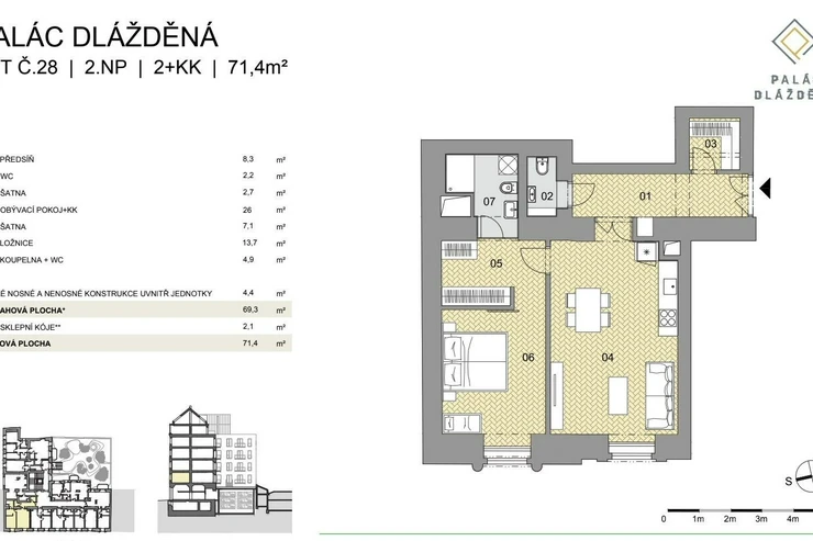 The spacious 2+kk apartment of 70m2 features an entrance hall, a living room with a fully equipped kitchenette, a bedroom with a dressing room, a bathroom with a shower and toilet, a second separate toilet, and a pantry/dressing room.