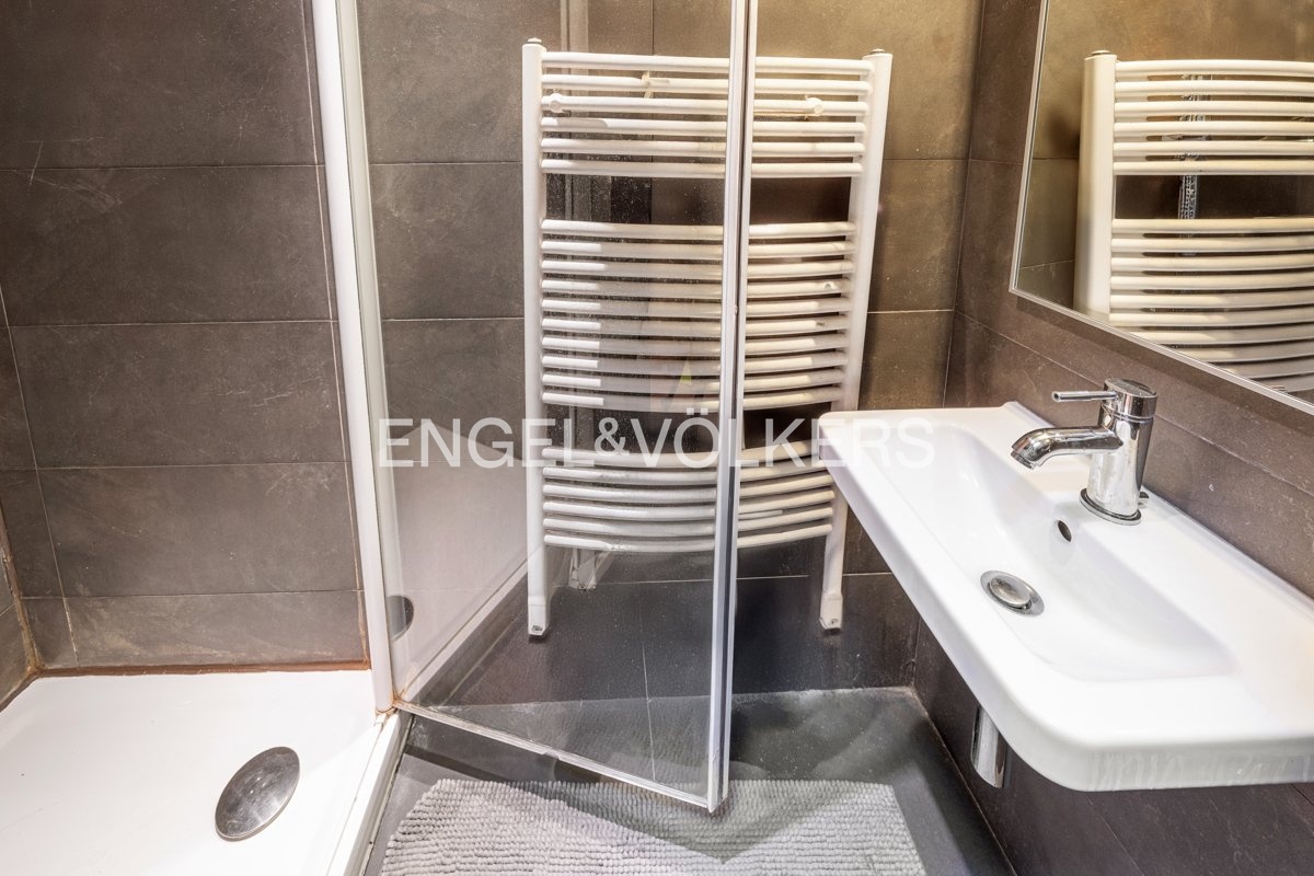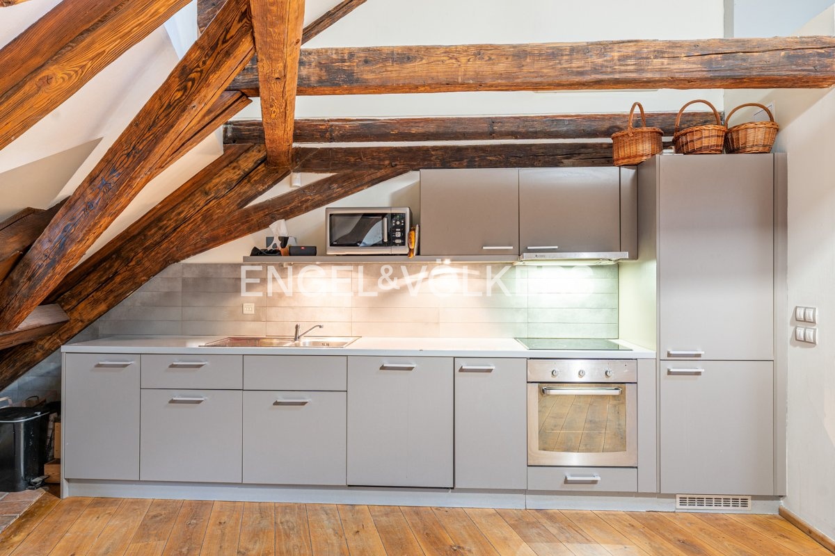 The apartment consists of two bedrooms and a living room with a kitchenette. The kitchen is equipped with built-in appliances and is situated in a space with exposed wooden beams. The apartment includes a bathroom, space for a washing machine and dryer, air conditioning, and its own gas boiler.