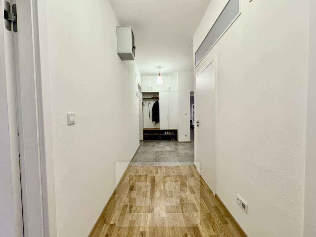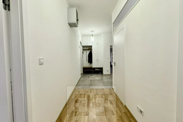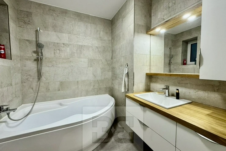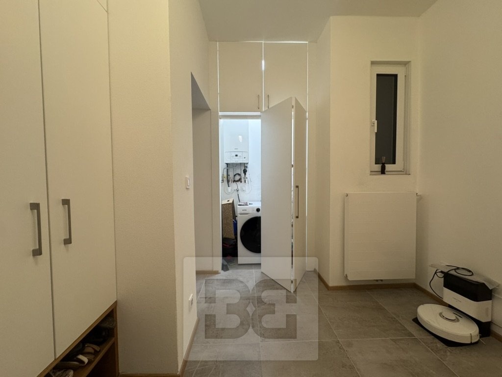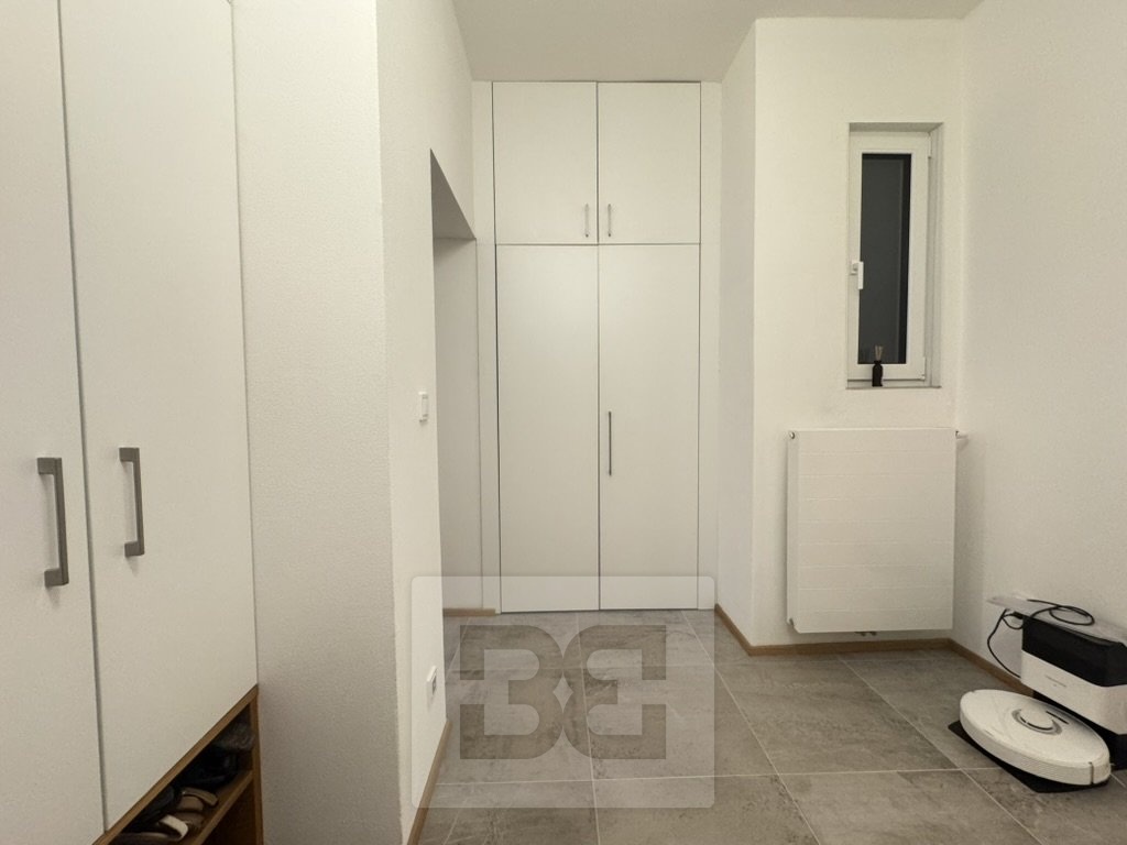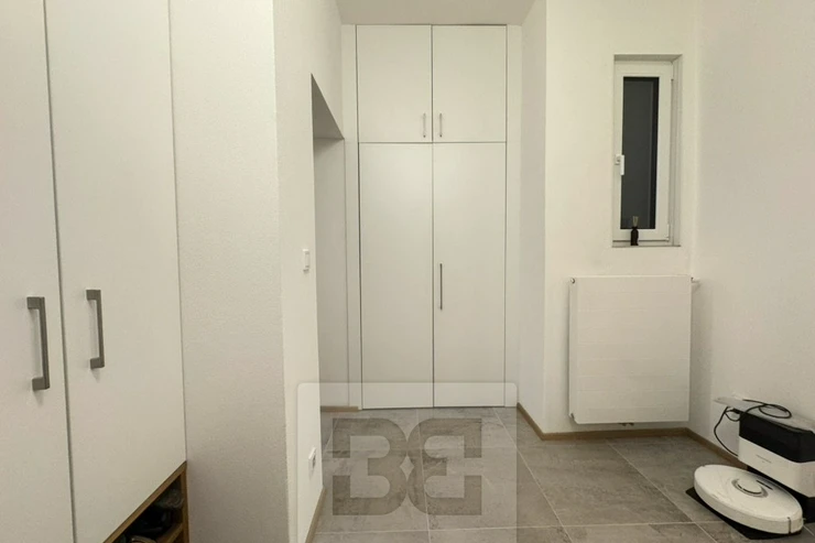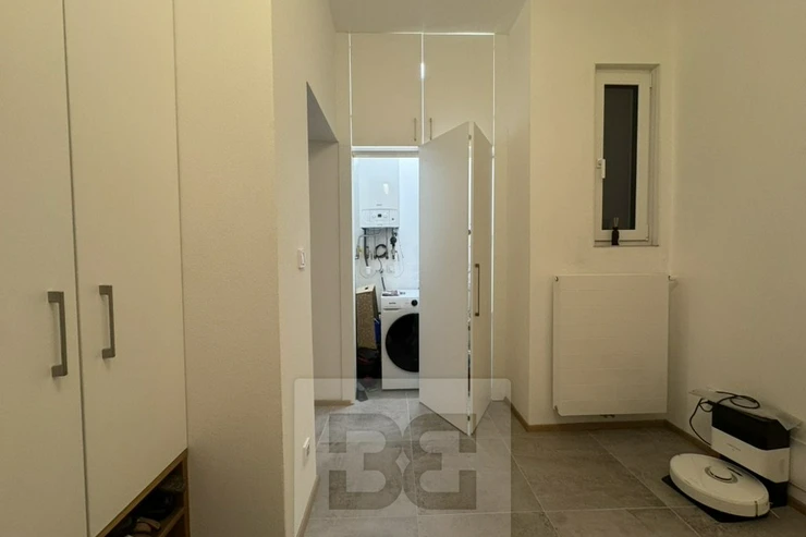 The apartment underwent a complete renovation two years ago, featuring new floors, a modern bathroom with a bathtub, separate toilet, and cleverly designed built-in storage including a hidden washing machine.