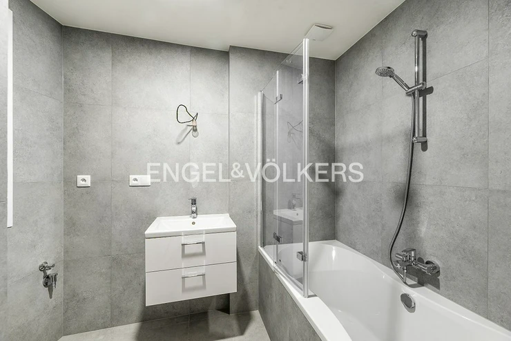 The bathroom is equipped with a bathtub with a glass shower screen and a washbasin with a cabinet. The apartment has new floors and interior doors. Heating and water heating are provided by a central gas boiler. Utility fees associated with the use of the apartment are 5,500 CZK for two people, and electricity is transferred to the tenant.
