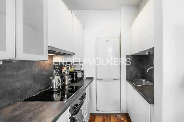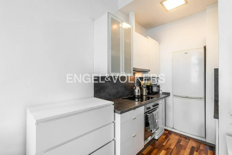 Available for rent from April 1, 2026, is a partially furnished 1+kt apartment on the 5th floor of a residential building in Na Žertvách Street near the Palmovka metro station. The apartment features one room with a kitchenette and a bathroom. The kitchen is equipped with a convection oven, microwave, hob, and refrigerator. The apartment includes a small entrance hall and a bathroom with a shower and a shared toilet. The washing machine is located in a shared hallway with the neighboring apartment.