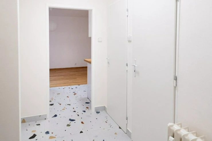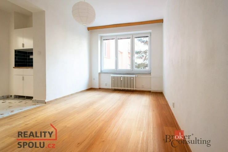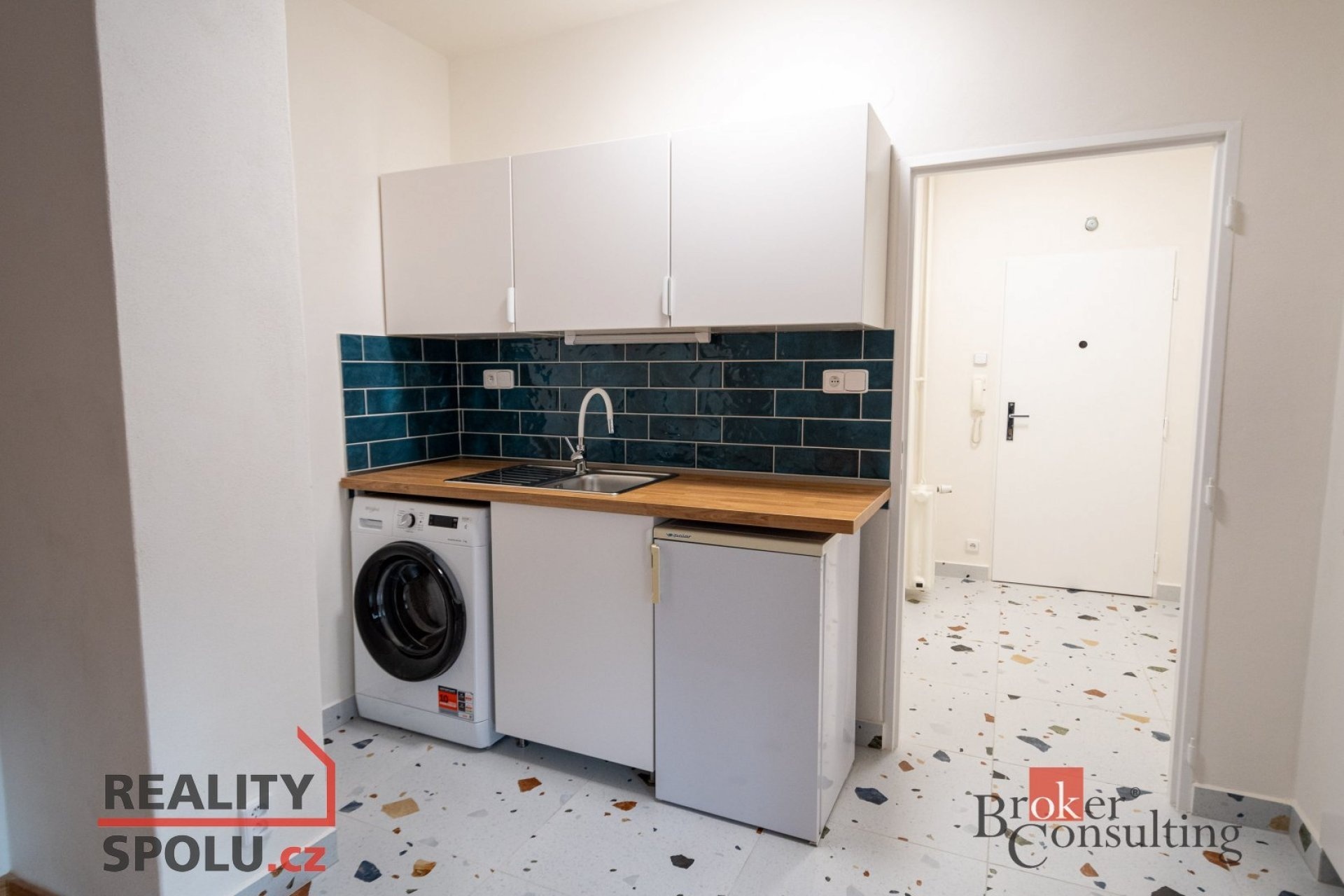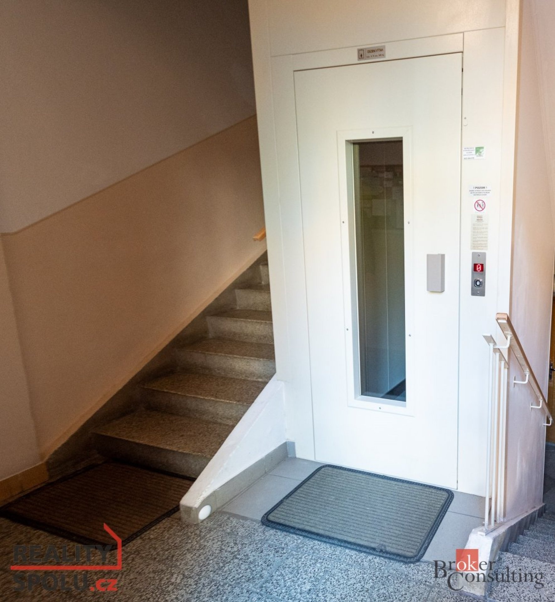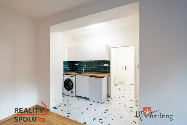 The apartment is situated on the 2nd floor of a building with an elevator and offers a view of mature trees in the inner courtyard. It is newly fitted with a kitchen unit and a washing machine. Partial furnishing can also be provided, including a 140x200 cm bed, a six-drawer chest of drawers, bathroom shelving, and a coat rack, for a symbolic fee of CZK 6,000 or incorporated into the rent.
