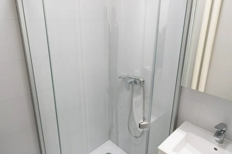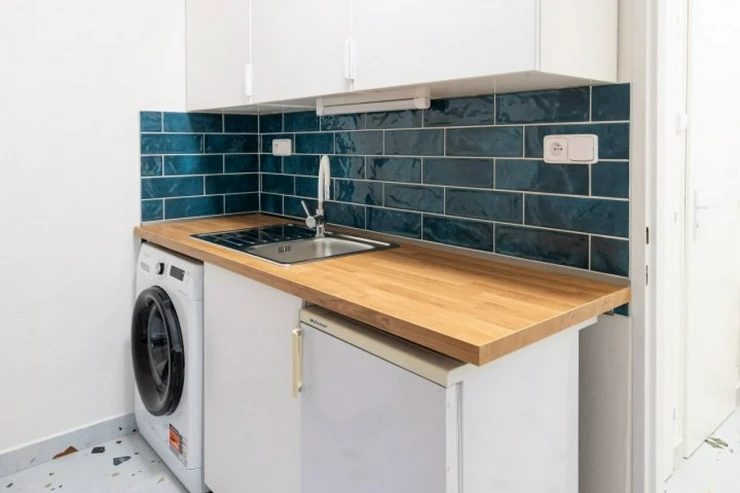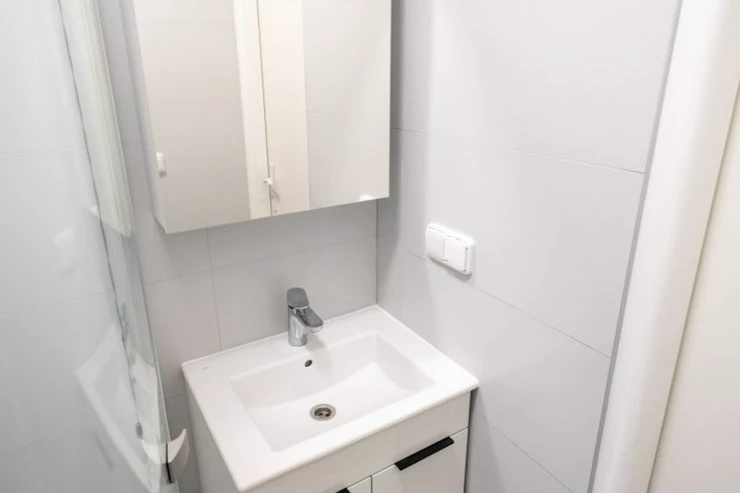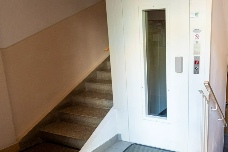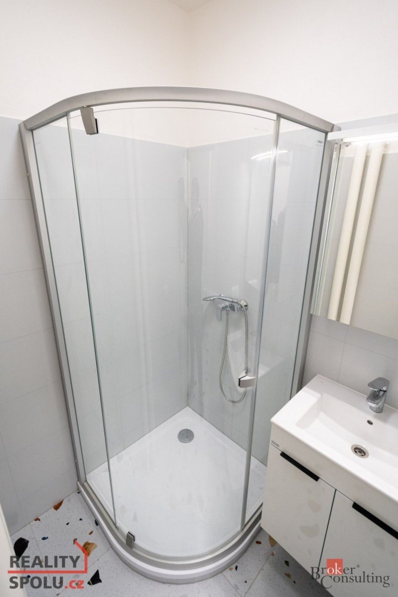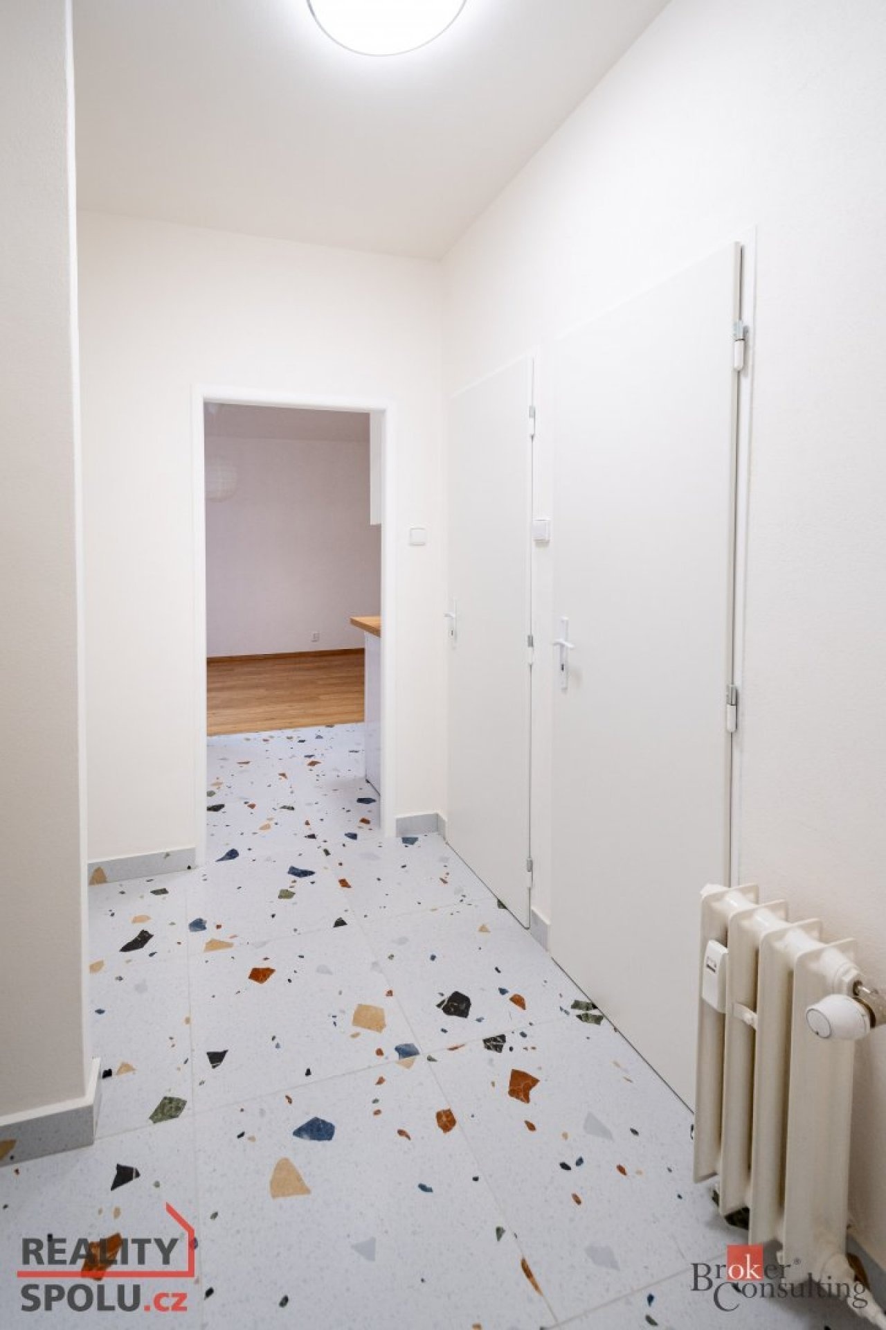 The apartment is situated on the 2nd floor of a building with an elevator and offers a view of mature trees in the inner courtyard. It is newly fitted with a kitchen unit and a washing machine. Partial furnishing can also be provided, including a 140x200 cm bed, a six-drawer chest of drawers, bathroom shelving, and a coat rack, for a symbolic fee of CZK 6,000 or incorporated into the rent.