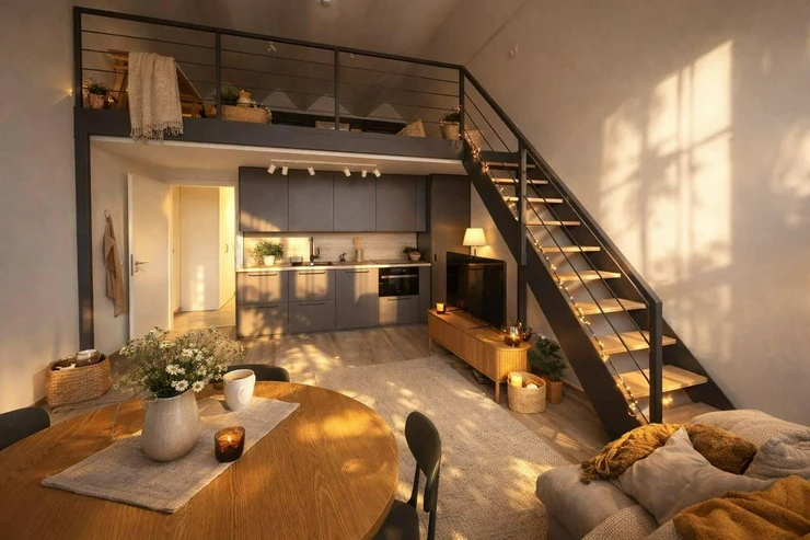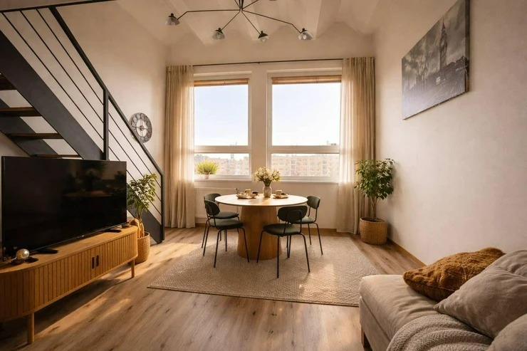 Po vstupu vás přivítá elegantní a prostorná chodba s velkou skříní, poskytující dostatek úložného prostoru. Světlý obývací pokoj se zvýšeným stropem a velkými okny vytváří vzdušnou a příjemnou atmosféru. Součástí prostoru je plně vybavený kuchyňský kout s moderními kvalitními spotřebiči.