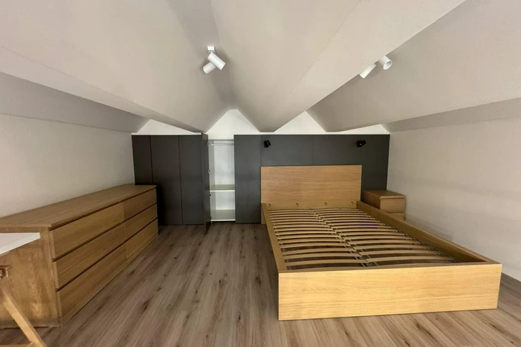 Z obývacího pokoje vedou stylové schody do ložnice se sníženým vlnitým stropem, která je vybavena kvalitní manželskou postelí (bez matrace), skříněmi na ukládání věcí a komodou. Koupelna je moderní, vybavená sprchovým koutem a novou pračkou. Veškerý nábytek a vybavení jsou součástí pronájmu byt je připraven k okamžitému nastěhování bez dalších investic.