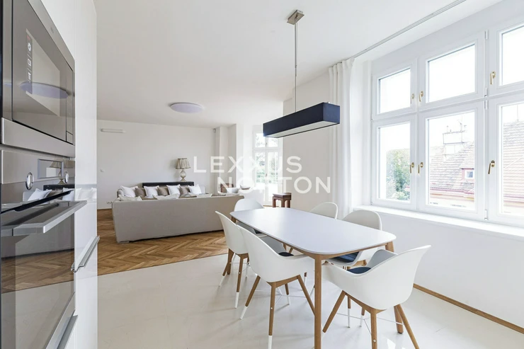 We offer for rent a partly furnished 3-bedroom apartment with a total area of 120 sqm with terrace (8 sqm) located on the first floor of a renovated First Republic villa without an elevator, in an attractive location in Prague 10 - Vinohrady, close to parks and with excellent transport infrastructure.The unit has three bedrooms, a spacious living room with access to a terrace (8 sqm), a fully equipped kitchen, three bathrooms, and a storage room. The apartment has a fully equipped kitchen with a stove, oven, refrigerator, freezer, dishwasher, and microwave. The apartment has air conditioning and floor heating. The bedrooms are equipped with beds and wardrobes. The living room has a sofa and dining table. The apartment has three bathrooms – one with a shower, toilet, and bidet, the second with a shower and toilet, and the third with a bathtub, toilet, and bidet. There is also a washing machine and dryer, and the apartment is equipped with an alarm system.The apartment is located in an attractive residential area of Prague 10 - Vinohrady. There are excellent civic amenities, shops, services, supermarket, restaurants, clubs; within walking distance there is a shopping centre OC Atrium Flora with its multiplex cinema, café, pharmacy and other services. Jiriho z Podebrad Square is close by with it´s popular farmer´s markets. For walks and relaxation you can use nearby Bezrucovy sady or Havlickovy sady with pavilion Grebovka. The location also has excellent transport accessibility; Flora and Jiriho z Podebrad metro stations are about ten minutes walk from the house. The tram stop Krymska and Ruska with day and night connections are just a few minutes walk away. There is a quick connection to the Prague highway by a car.The inquiring client agrees to pay a commission of 1 month's rent plus VAT.If you cannot view the property in person, we also offer you a video tour from the comfort of your home in real time via Messenger, WhatsApp and other communication platforms.