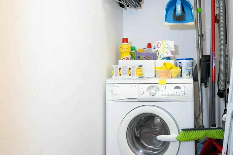 The apartment is divided into a spacious living room with a kitchen and a balcony, a hallway with plenty of storage space, a bathroom with a washing machine and a toilet. The apartment is fully equipped. The living room includes a kitchen including appliances. There is also a dining table and dining chairs. A double bed, a built-in wardrobe, an armchair, shelves and a work desk with a chair.