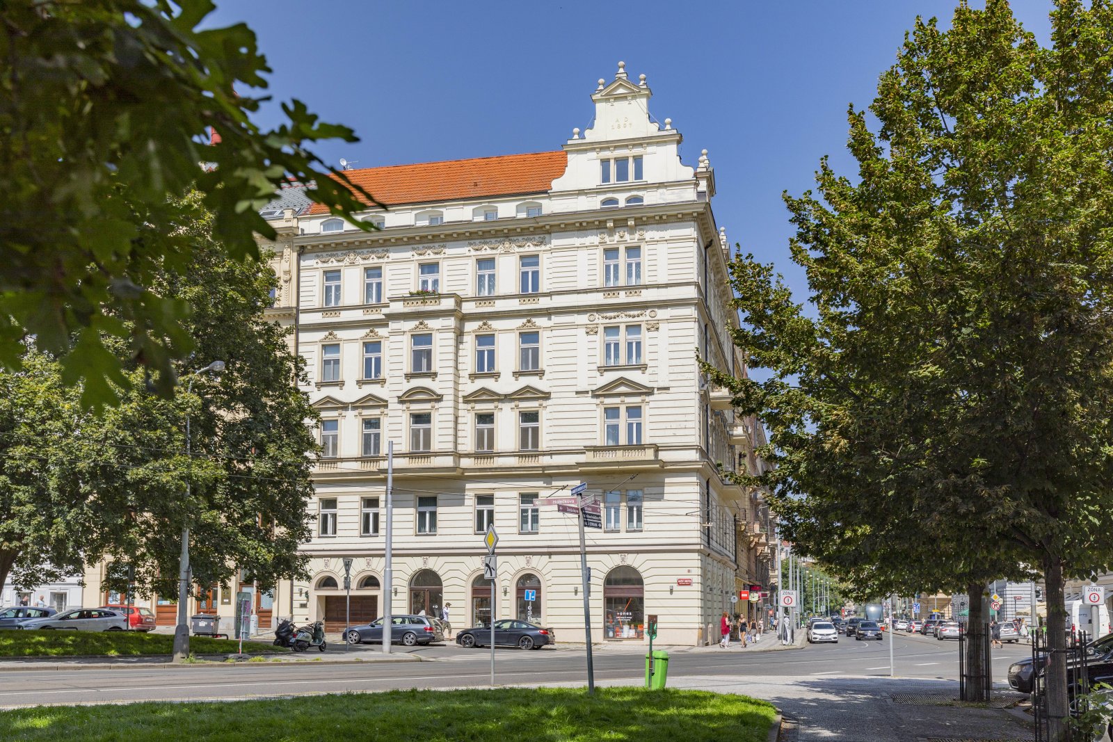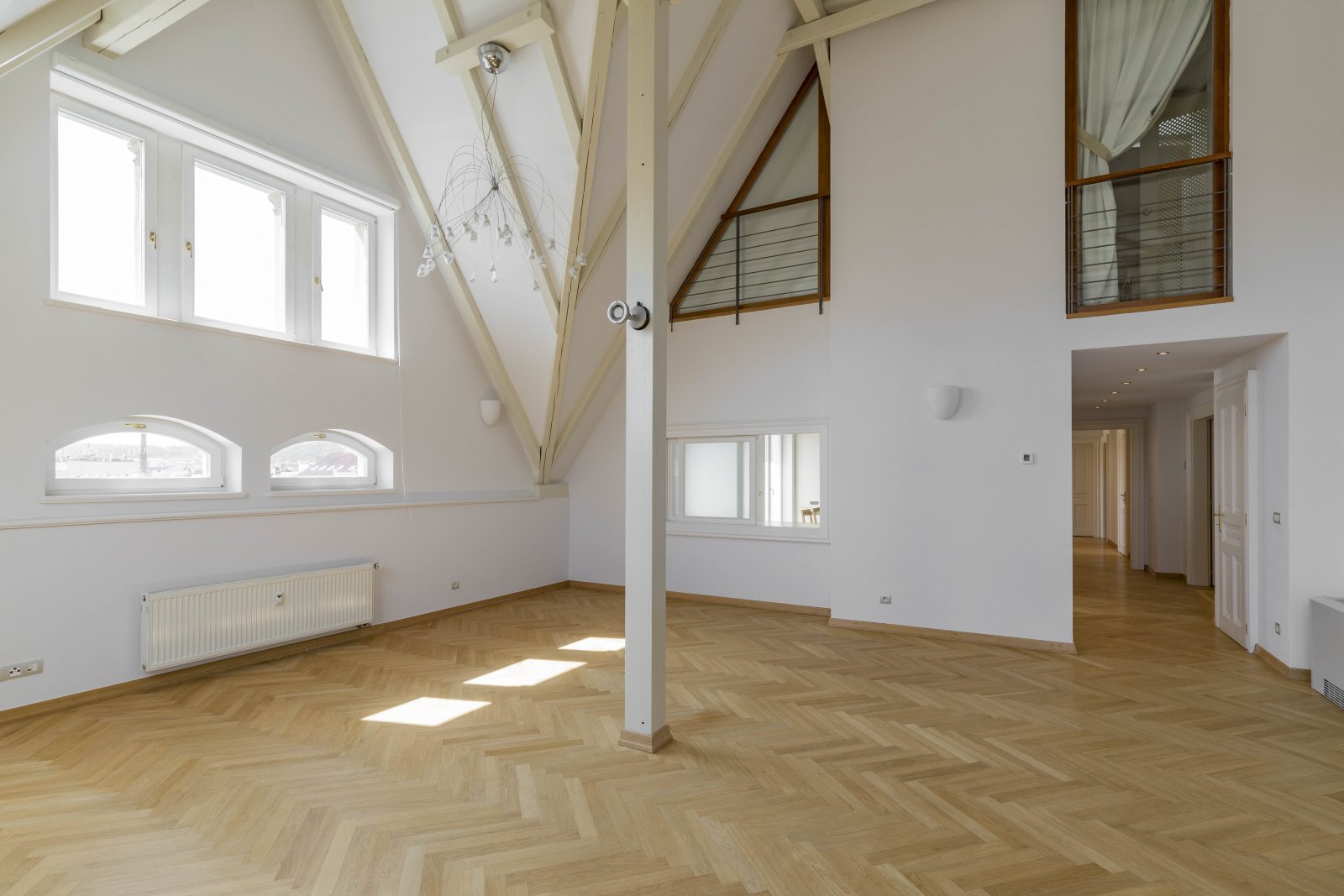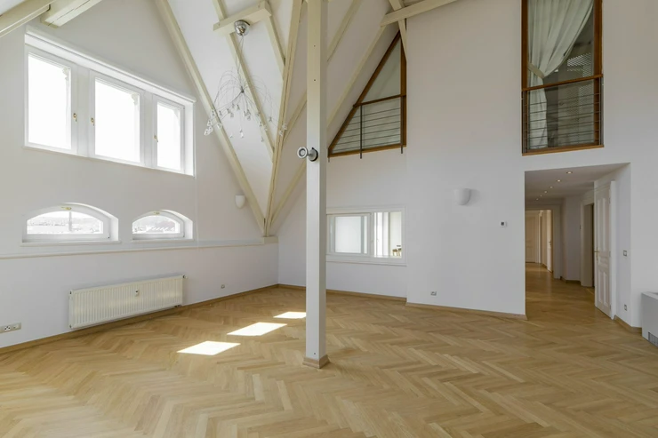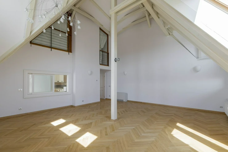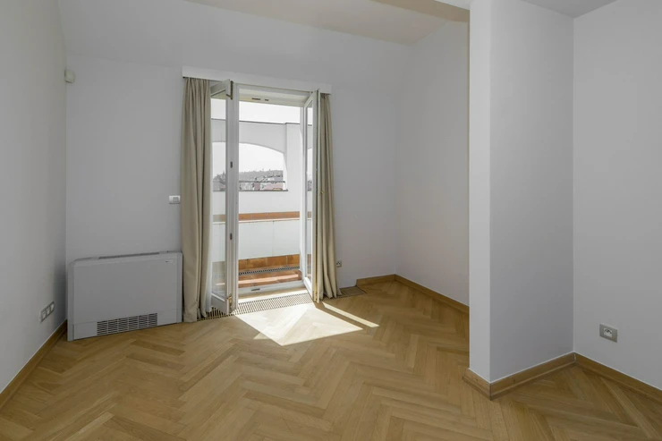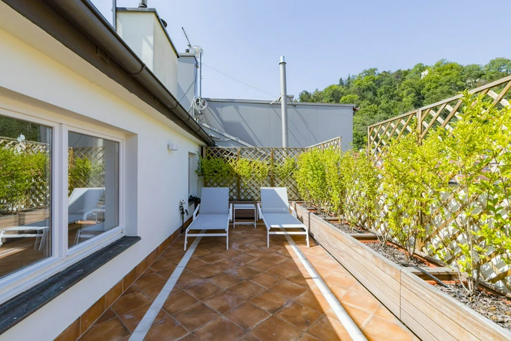 We offer for rent a representative four bedroom duplex apartment with a large terrace on the 5th and 6th floor of a renovated neo-renaissance apartment building with an elevator in a sought-after location of Prague 5 on the border of Malá Strana and Smíchov. The apartment has a total area of 286 sqm and offers on the lower lever an entrance hall, a spacious living room, a fully equipped kitchen with all appliances (ceramic hob, oven, refrigerator, dishwasher and microwave), 1 bedroom with a private bathroom with a bathtub, shower, toilet and bidet, a dressing room and access to the balcony. Two more bedrooms, both with access to the balcony, 1 bathroom with bathtub, toilet and bidet, a small dressing room and a storage room. On the upper level there is an open room with the possibility of using it as a guest bedroom or a playroom for children, 1 bathroom with shower, toilet and bidet, laundry room with washing machine and dryer and a 35 sqm terrace with a pergola, a seating area with a breathtaking view of Petřín Hill and Prague Castle. The apartment is partially furnished and its equipment includes a dining table with chairs, a bed and a built-in wardrobe in the bedroom, a fitted wardrobe, curtains, shelves in the bathroom, air conditioning, alarm, videophone, security door, wooden parquet floors, marble floors in the bathrooms, gas heating. There is outdoor furniture and a pergola on the terrace, and an irrigation system has been installed for the plants on the terrace. There is also a basement storage for use.The house has a daily reception desk and the possibility of using the maintanance services. Perfect location opposite Petřín Park, within walking distance of Prague Castle, Charles Bridge, Lesser Town Square. The house is surrounded by all civic amenities: restaurants, cafes, bistros, shops, medical facilities. Just a few steps from the French Lyceum, tram station, Anděl metro station and Nový Smíchov shopping center. By car, close access to the Prague Ring Road and the highway network. Parking space in the garage on the stacker suitable for low cars with a height of up to 150 cm directly in the house for an extra fee of CZK 3,900 + VAT/month. For larger cars, it is possible to use parking in Drtinova Street for an extra fee. The tenant of the apartment has the opportunity to become a member of the Elliptico wellness club in the Ellipsis residence in Holečková Street for a fee.