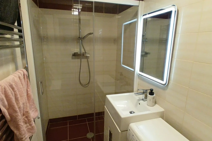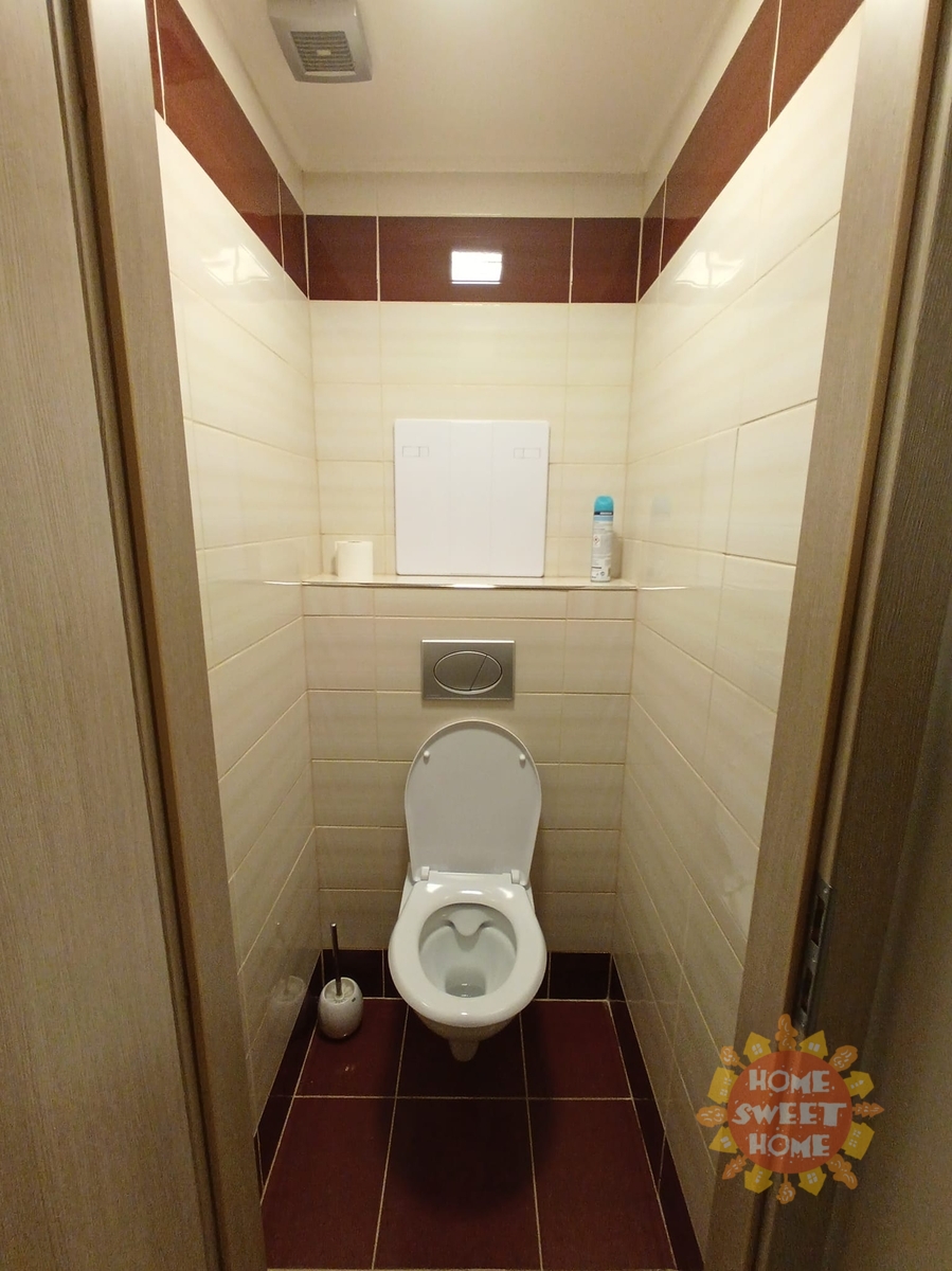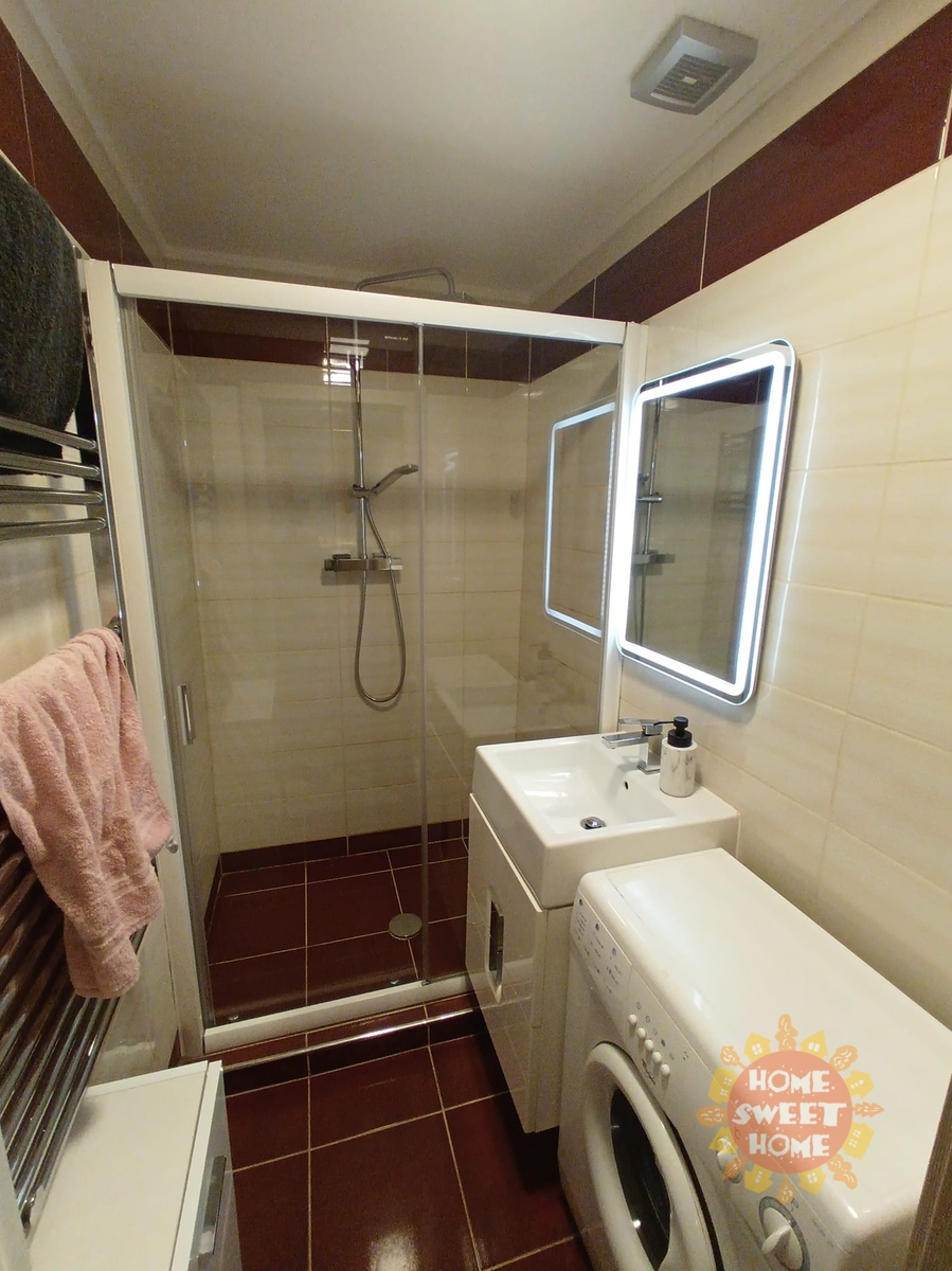 The bathroom is equipped with a spacious shower and washing machine. The toilet is located separately, ensuring maximum comfort for residents. The apartment has central heating.