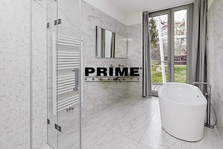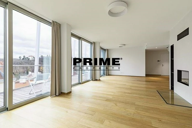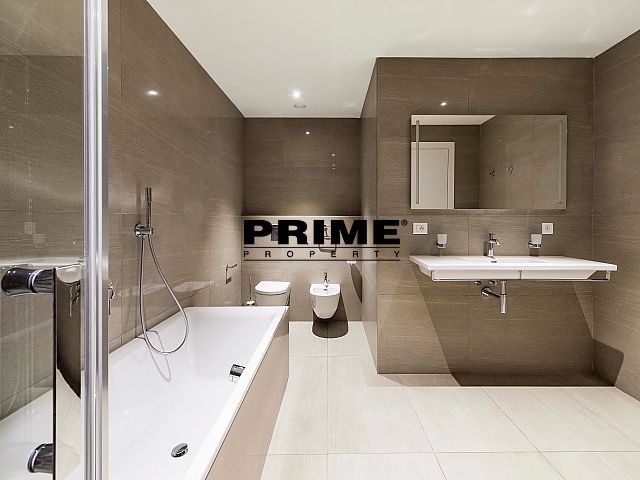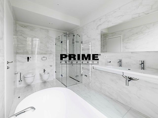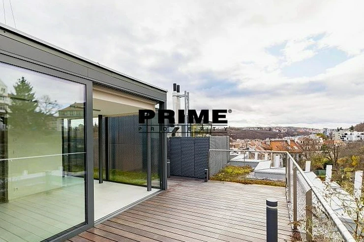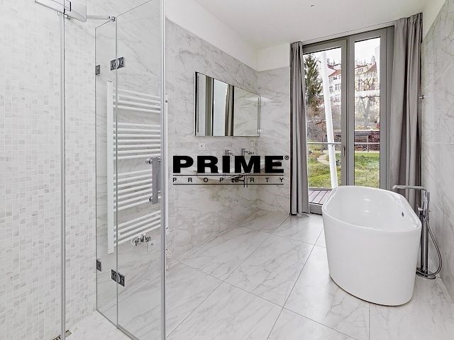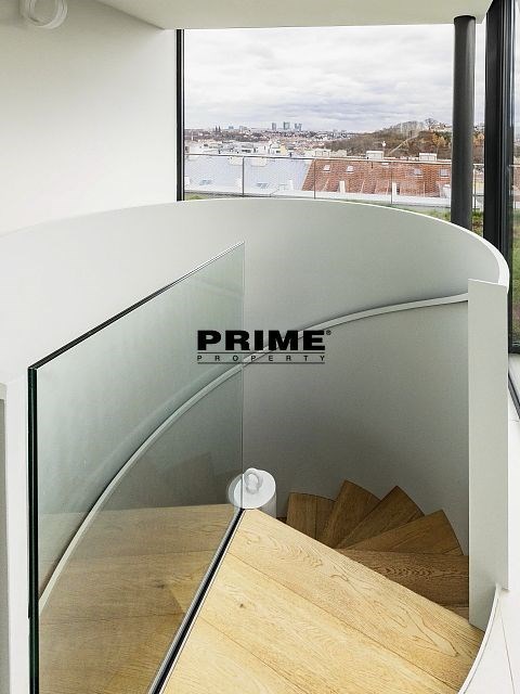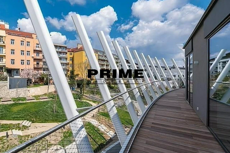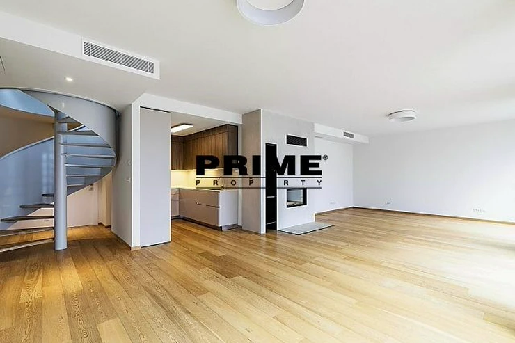 Modern, exclusive, air conditioned, 3 bedroom, 3 bathroom, unfurnished duplex apartment for rent, 4+kk, 212m2, with a sauna, 3 terraces (total 80m2), a 31m2 garden and the possibility of a garage parking space, situated on the 5th floor with a lift of a newly built residential complex with a central reception desk, a wellness club (an indoor swimming pool, a sauna and a terrace with sun loungers), a shared garden with benches and underground parking.