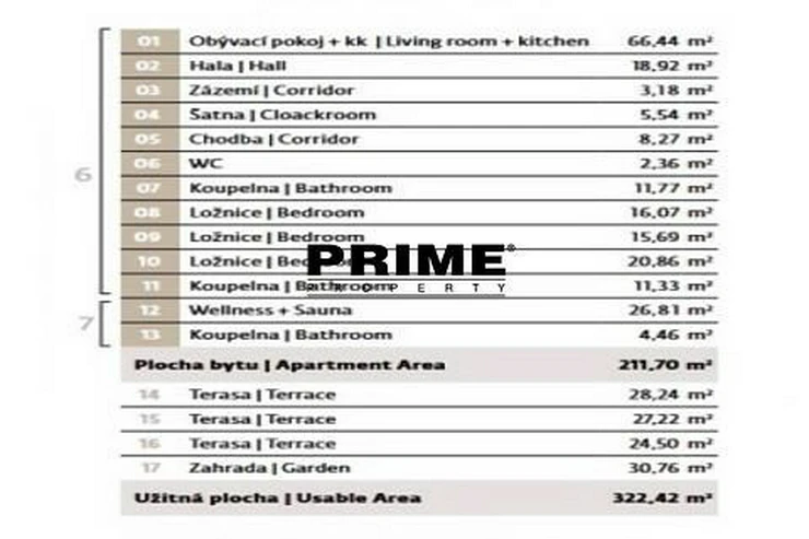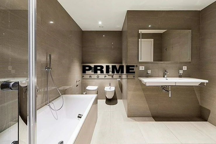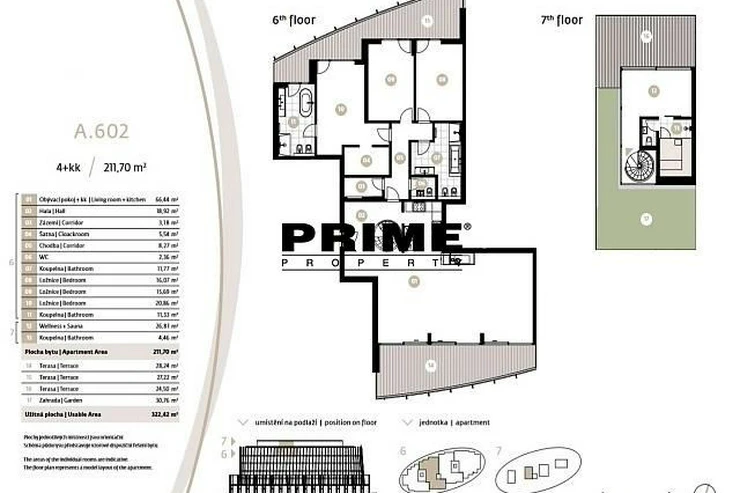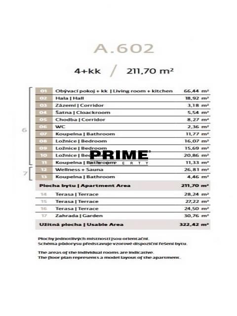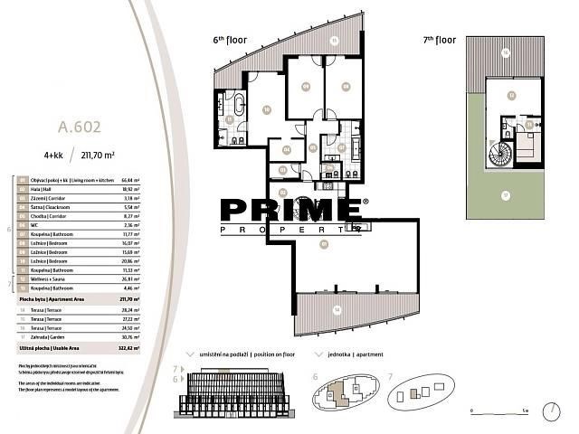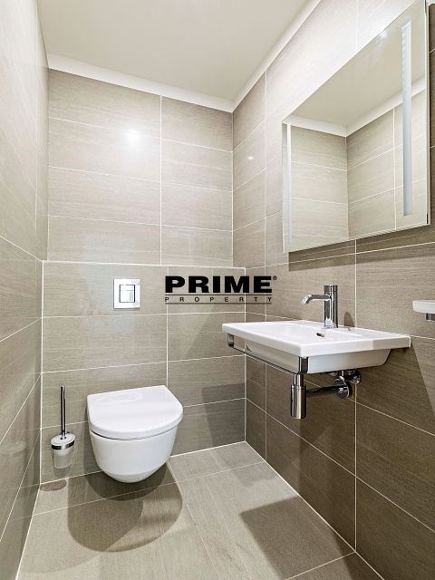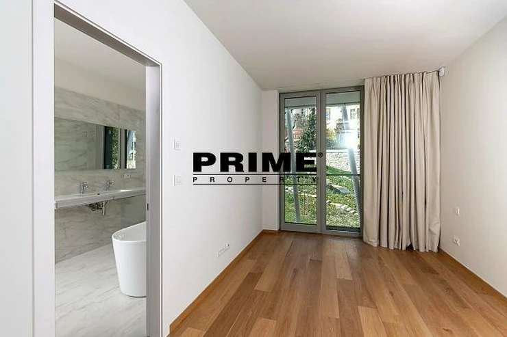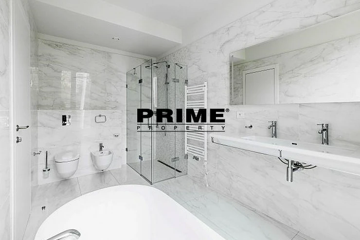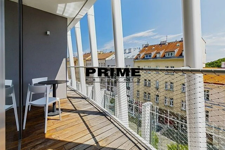 Modern, exclusive, air conditioned, 3 bedroom, 3 bathroom, unfurnished duplex apartment for rent, 4+kk, 212m2, with a sauna, 3 terraces (total 80m2), a 31m2 garden and the possibility of a garage parking space, situated on the 5th floor with a lift of a newly built residential complex with a central reception desk, a wellness club (an indoor swimming pool, a sauna and a terrace with sun loungers), a shared garden with benches and underground parking.