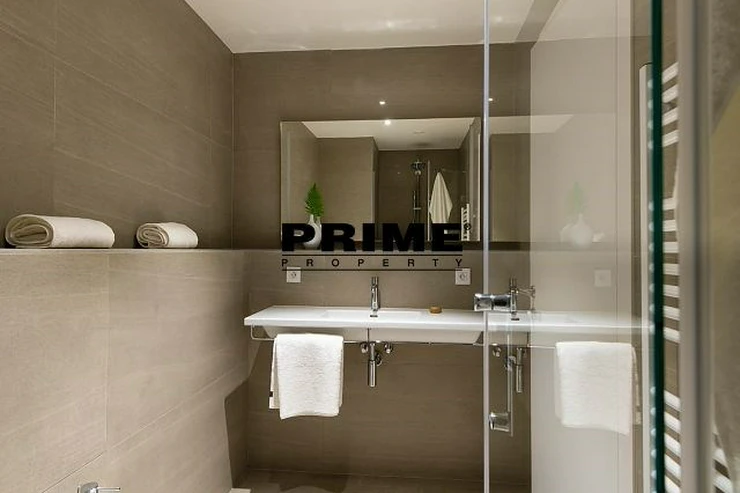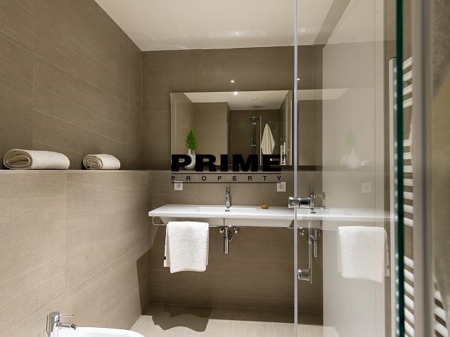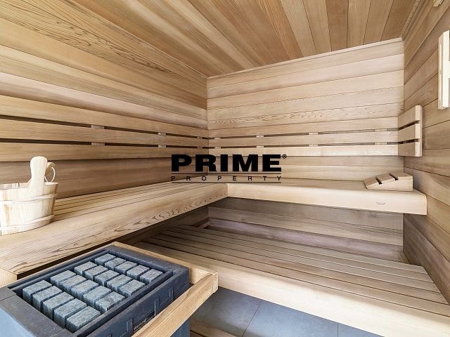 The main level of the property comprises: a spacious living room (66.5m2) with a fireplace, with a dining area, with access to a 28m2 terrace and an open, fully fitted Italian kitchen with appliances (electric induction cooking hobs, electric oven, refrigerator, dishwasher), a 21m2 master bedroom with an en suite bathroom (bathtub, shower cubicle, sink, toilet and a bidet) and access to a 27m2 terrace, 2 more bedrooms (16m2 and 16m2) with access to a terrace, a 2nd bathroom (bathtub, shower cubicle, sink, toilet and a bidet), a walk in closet and a separate WC. The upper level: a wellness area with a sauna, a bathroom (shower cubicle, sink and a toilet), a 24.5m2 terrace and a 31m2 garden.