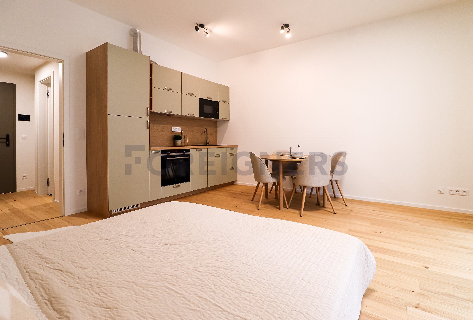 The studio is furnished with a high-quality bed and mattress, a dining table with four chairs, and offers enough space to arrange the interior to suit your lifestyle.