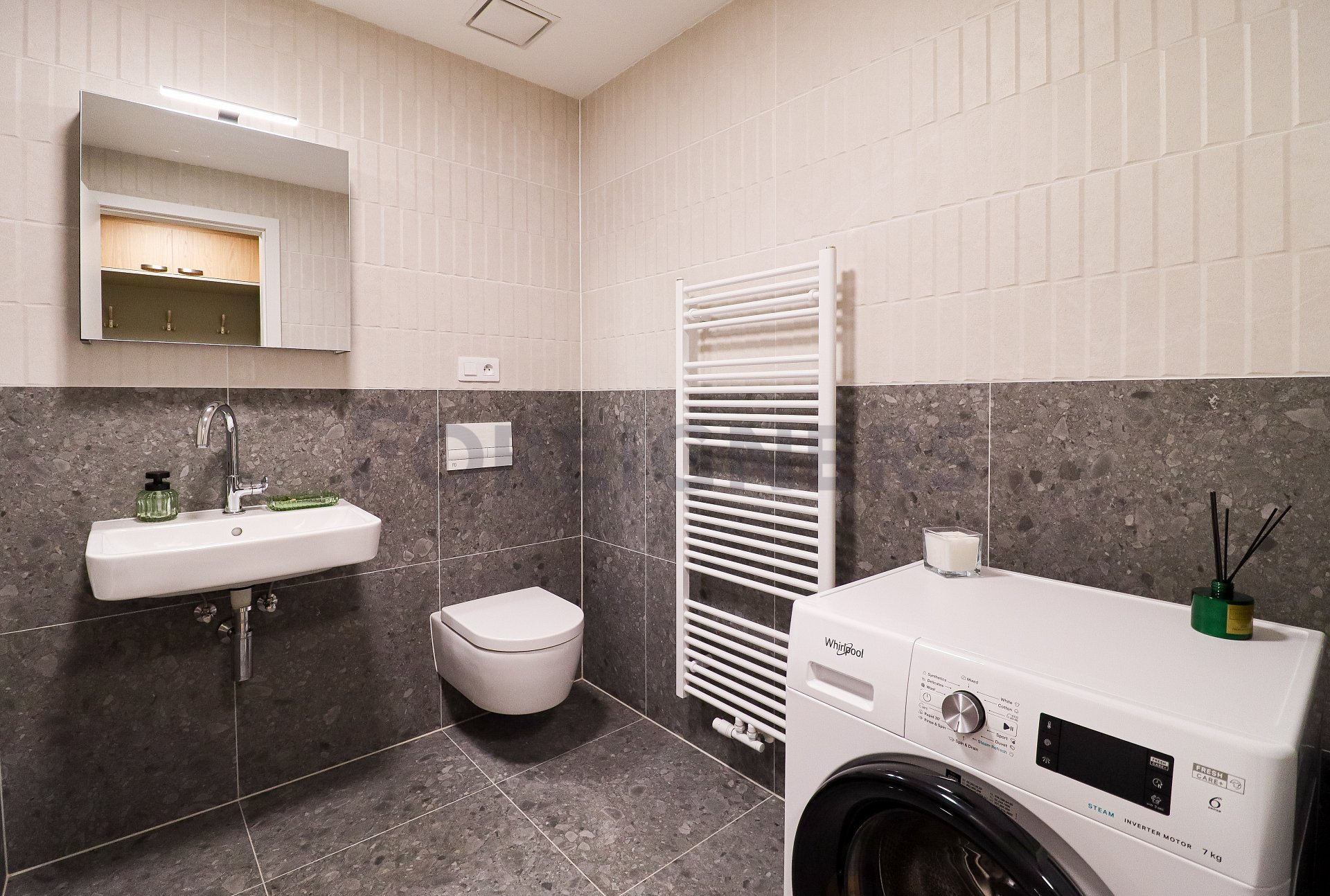 The bathroom combines elegant design with practicality – in addition to a bathtub, washbasin, and toilet, there is also a washing machine, ensuring full comfort without the need for any additional investment.