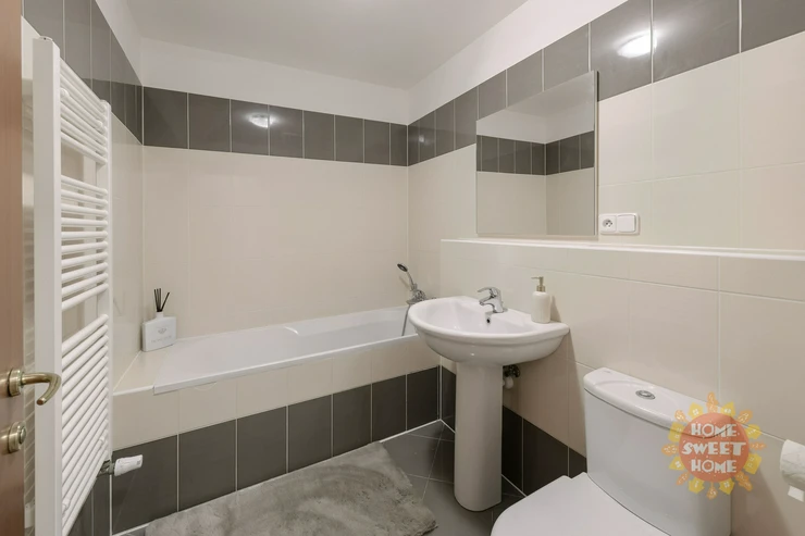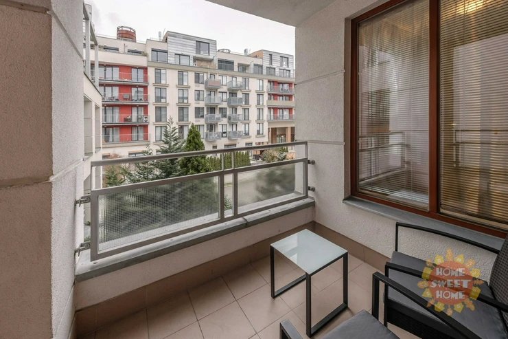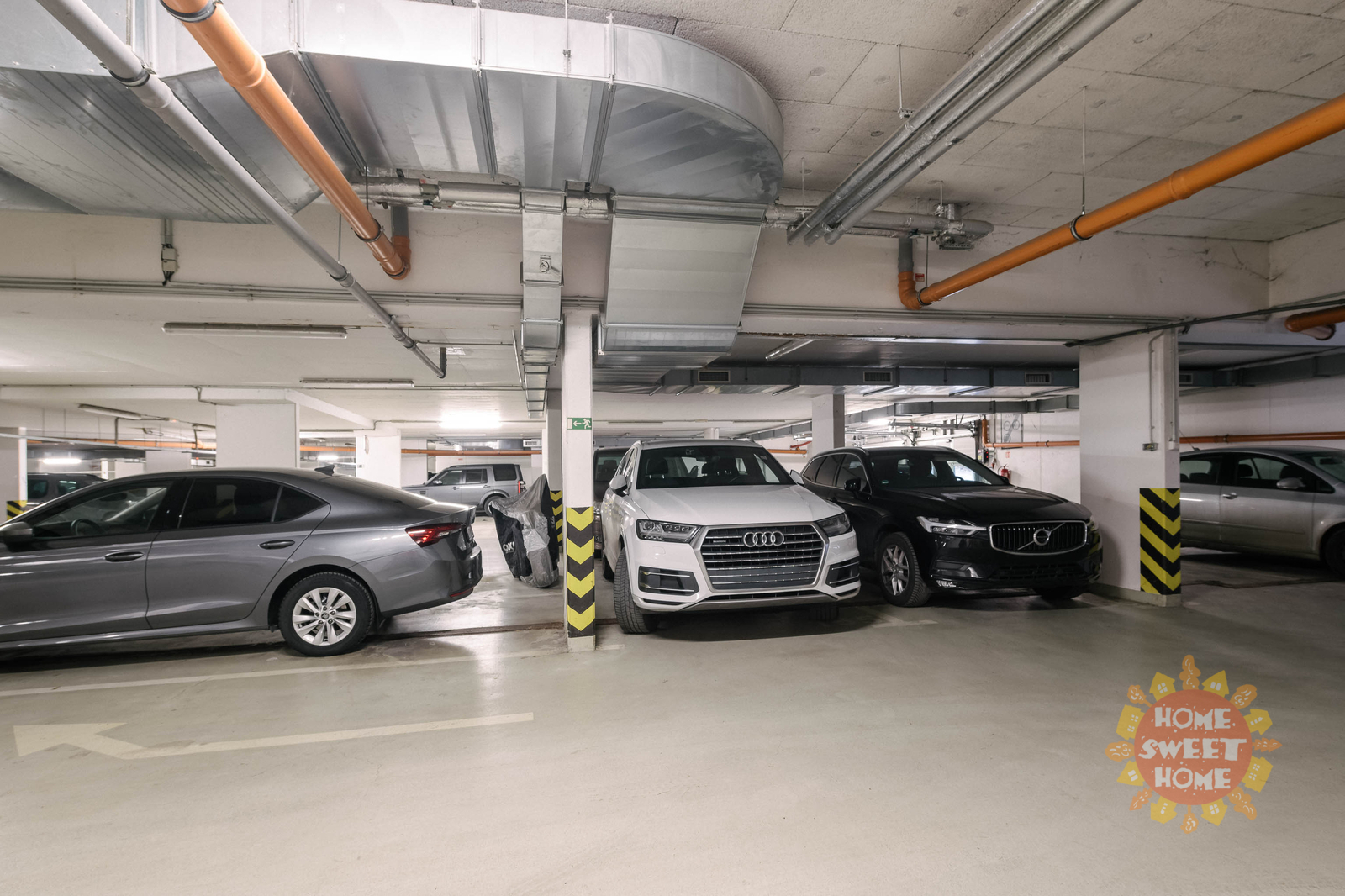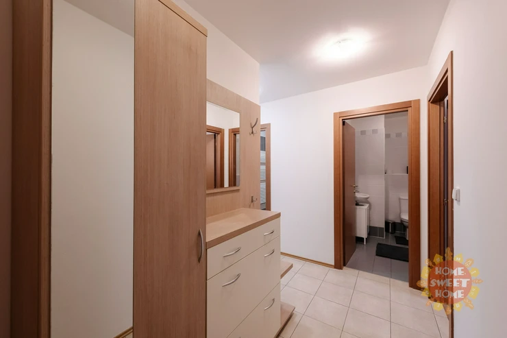 entrance hall with wardrobe and shoe rack (7 sqm), living room (34 sqm) equipped with sofa, dining table with chairs, coffee table, TV table and TV (all new), kitchen equipped with all appliances (fridge, ceramic hob, dishwasher and microwave), entrance to the terrace facing the courtyard equipped with garden furniture, bedroom (16.40 sqm) equipped with a high-quality comfortable bed, built-in wardrobe, bedside tables with lamps and access to the balcony, second room (10 sqm) equipped with a bed, wardrobe, desk with chair and armchair, bathroom (4.20 sqm) with bathtub and toilet, another toilet (2.91 sqm) separate and washing machine. The floor is carpeted, wooden floor and tiles. One garage space is included in the rent.