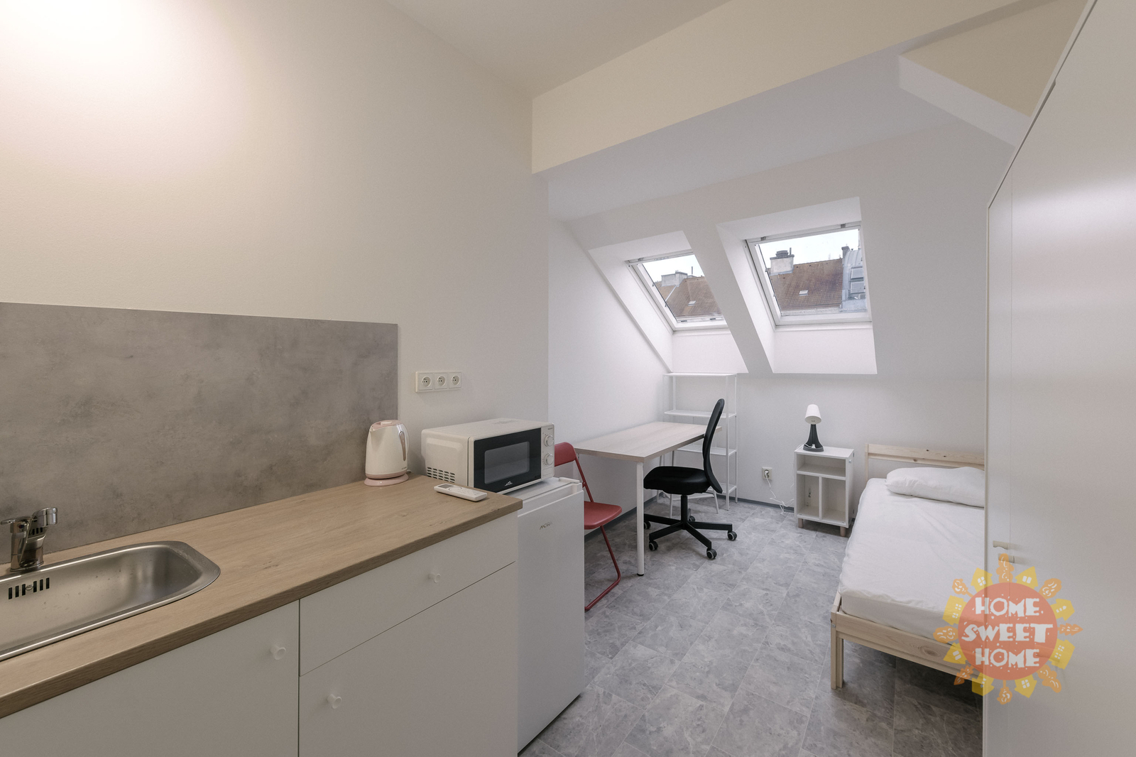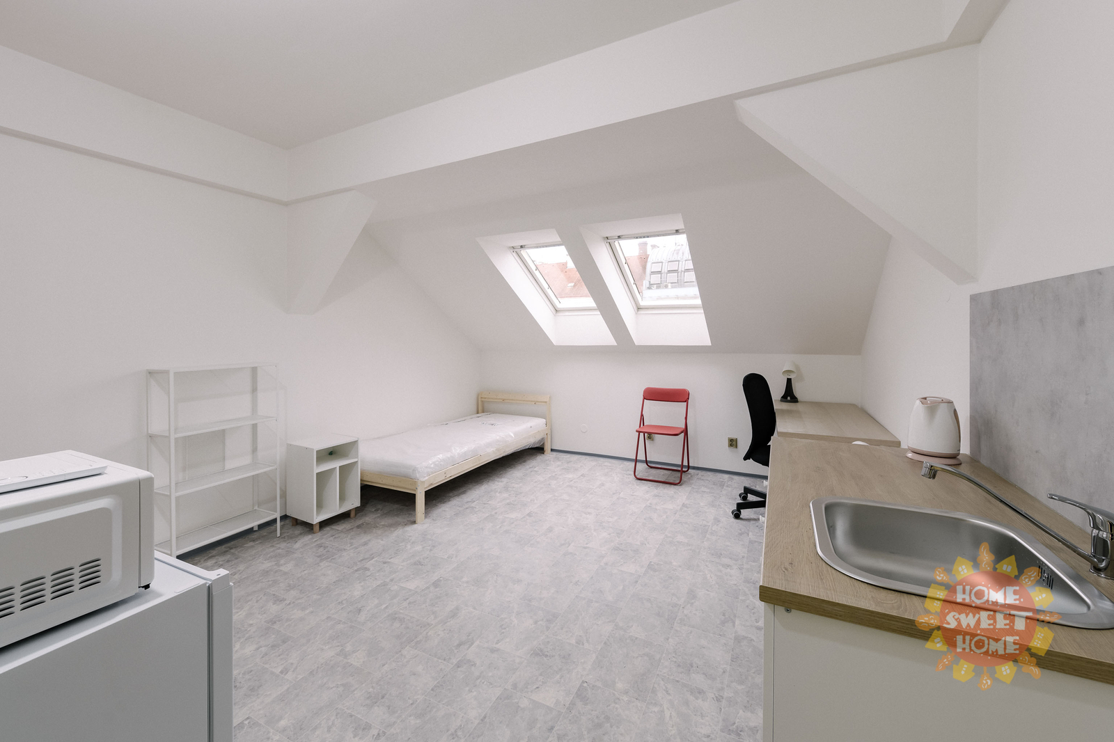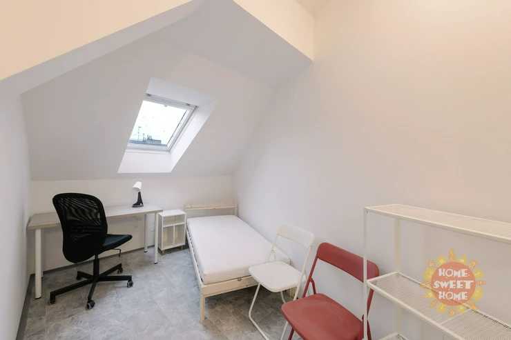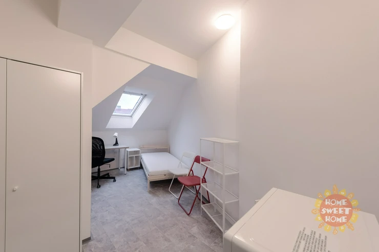 We offer a 12 m² room for rent in a shared apartment that has been completely renovated. The apartment is located on the 4th floor of a brick building on Na Žertvách Street, Prague 8 – Palmovka. The room is part of a nine-room apartment. The shared areas include a fully equipped communal kitchen, a laundry room with a washing machine and dryer, two bathrooms with showers, and three separate toilets. All rooms are modernly furnished with air conditioning, a desk, chair, bedside table, single bed including mattress, and a wardrobe. Some of the rooms have its own small kitchenette. The service charges also include high-speed internet connection and cleaning of the common areas.