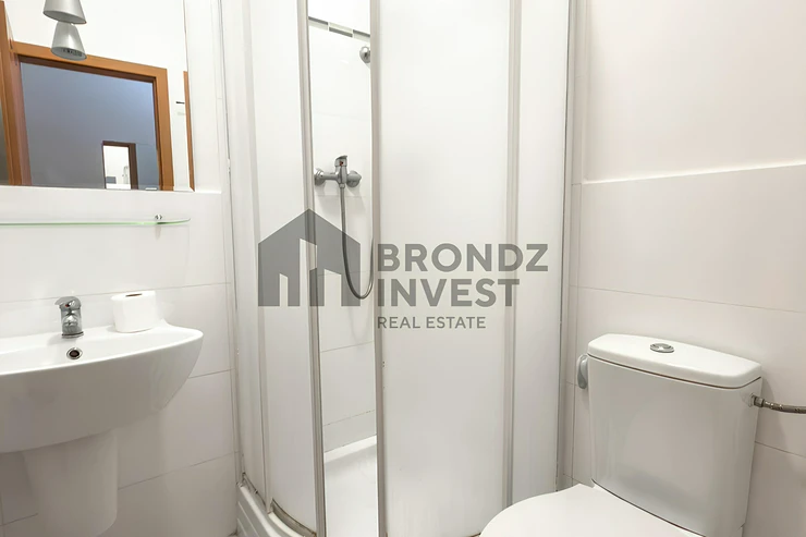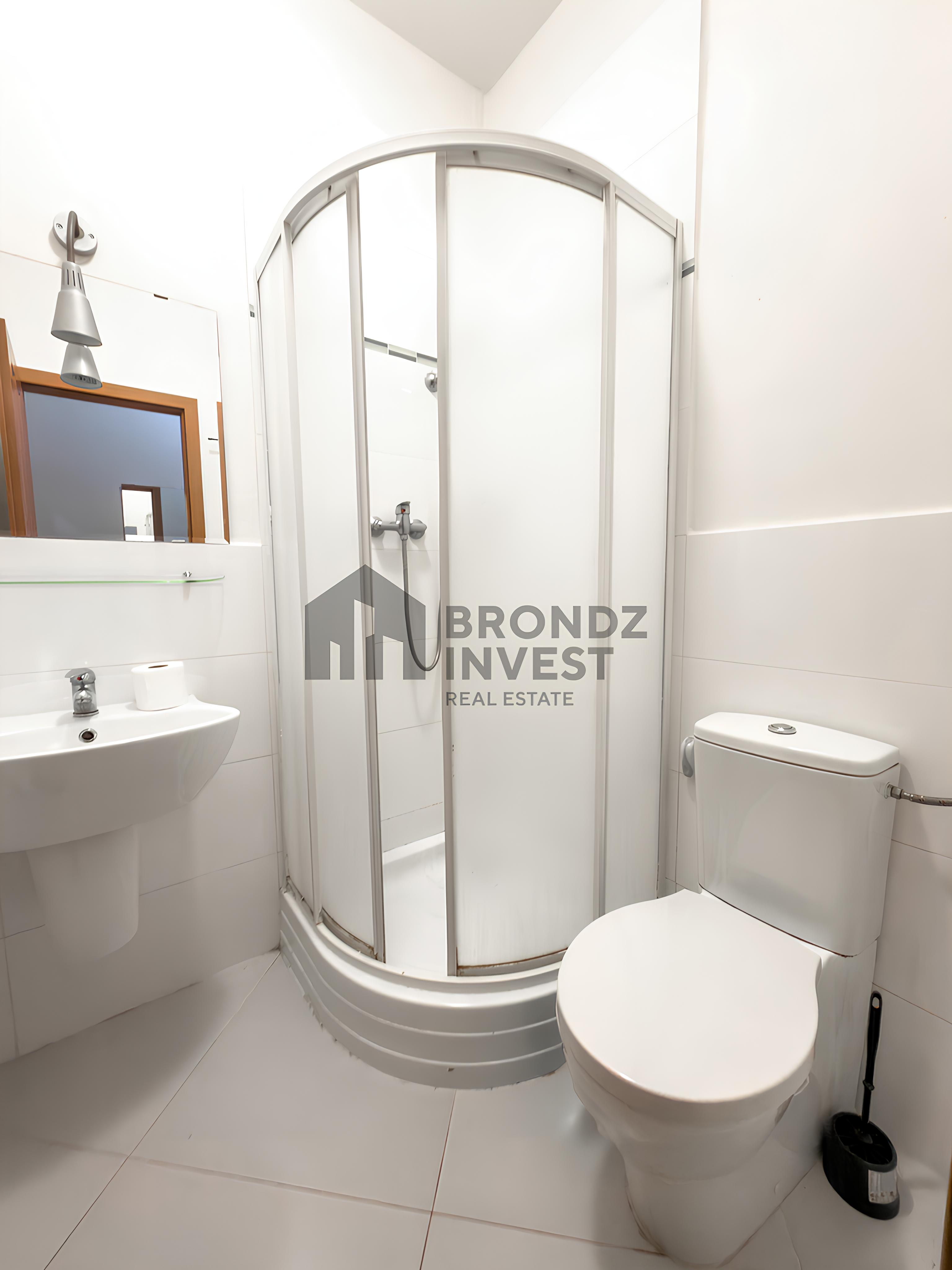 The apartment consists of an entrance hall, a spacious bedroom, a kitchen, and a bathroom with a shower.