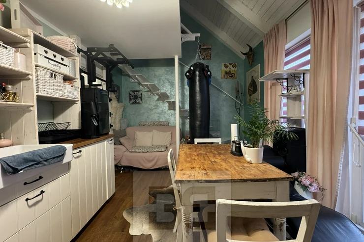 Obývací část je vybavena kuchyní s varnou deskou, digestoří, mikrovlnou troubou, lednicí, kávovarem a základním nádobím, jídelní stůl s židlemi, prosklená vitrína, rozkládací křeslo a krásné dekorace. Vstupní chodba s obrovským zrcadlem. Koupelna se sprchovým koutem.