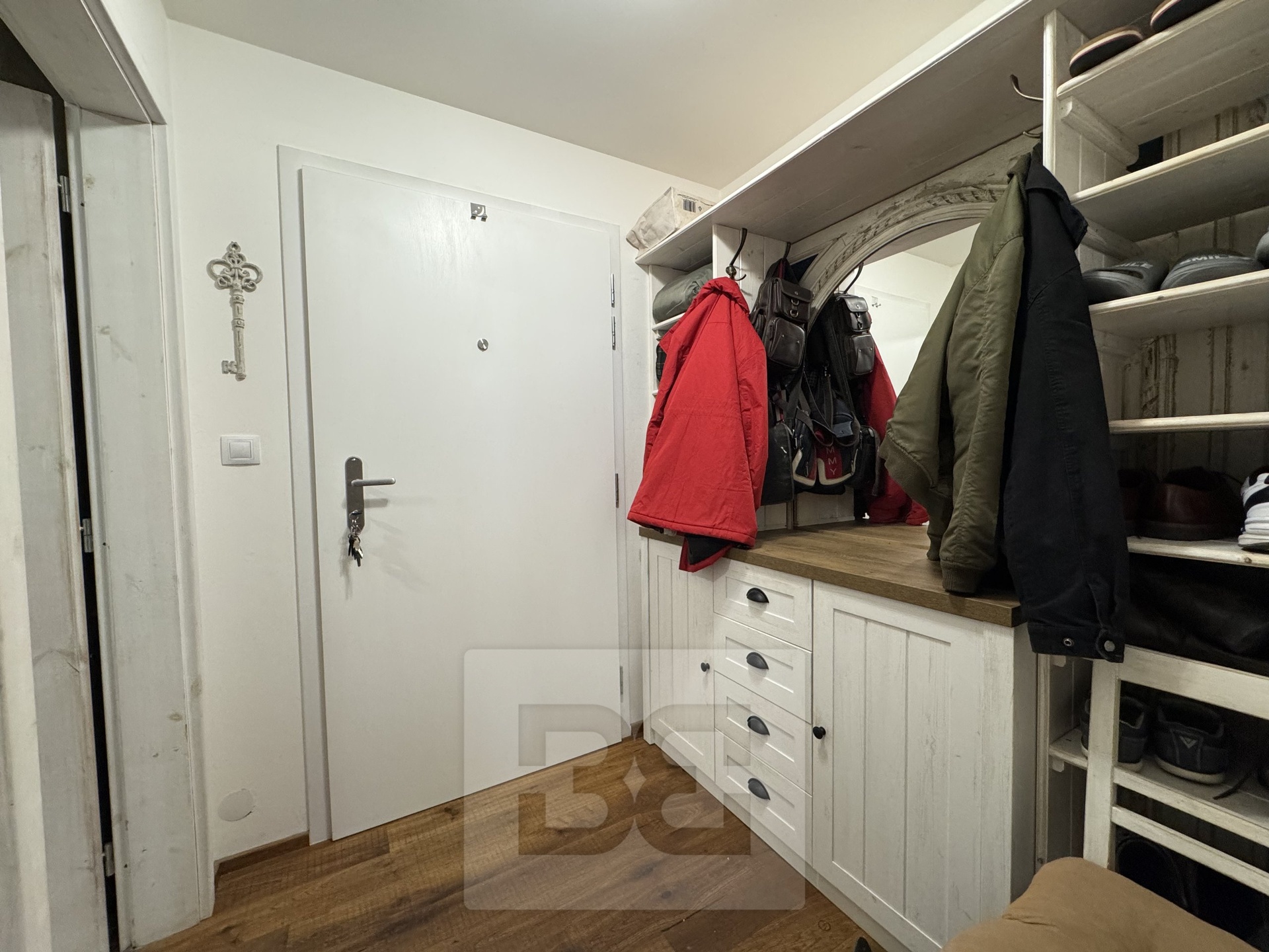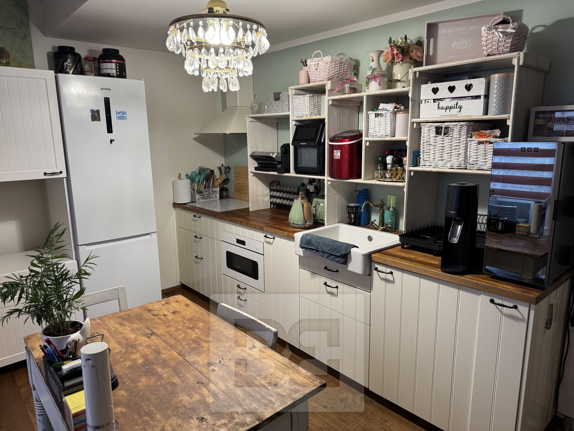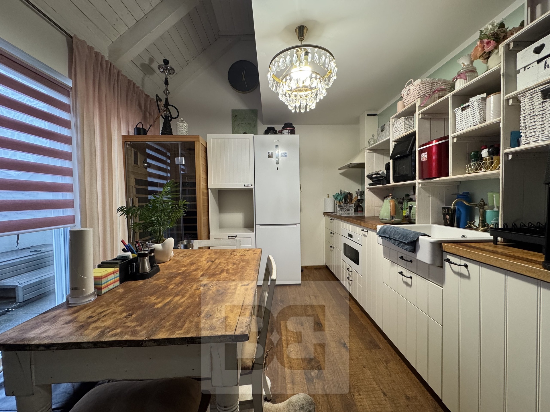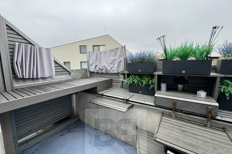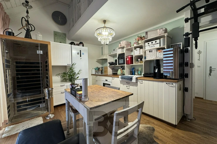 Byt je oproti fotografiím vybaven kuchyňskou linkou se spotřebiči bez horních polic, stolem se židlemi, postelí a komodami. zbývající nábytek je podnájemník ochoten prodat. Veškeré dřevěné doplňky, police, sauna obložení terasy apod. je stávajícího nájemníka.