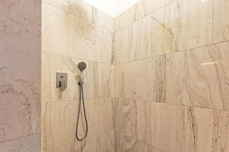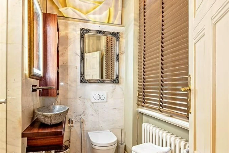 The interior is complemented by solid wooden floors, granite tiles, and marble cladding. Internet and TV connection are standard.