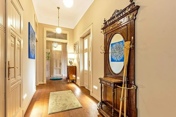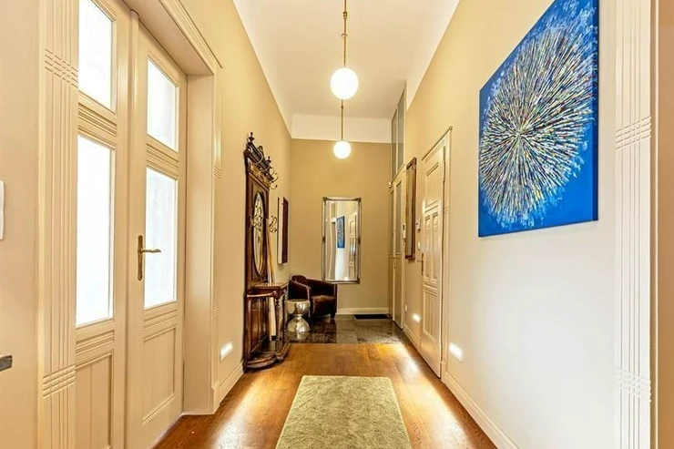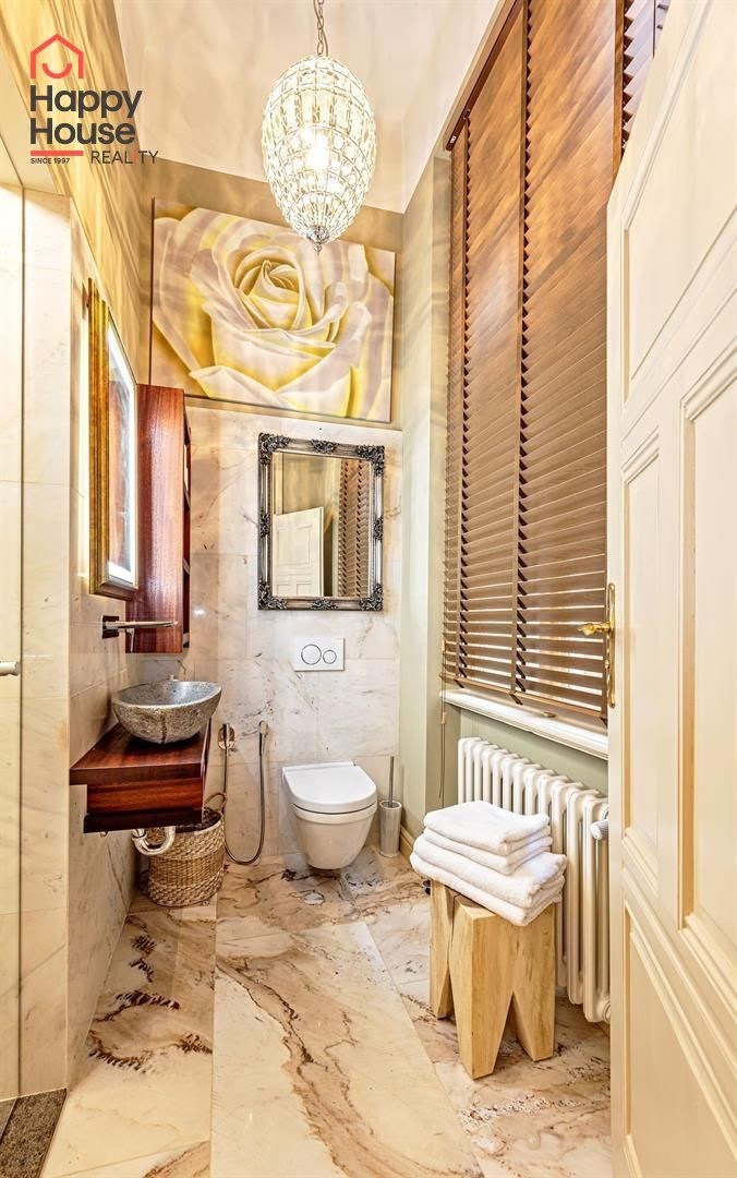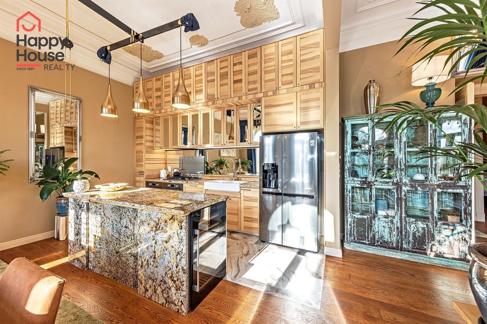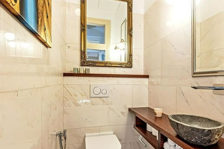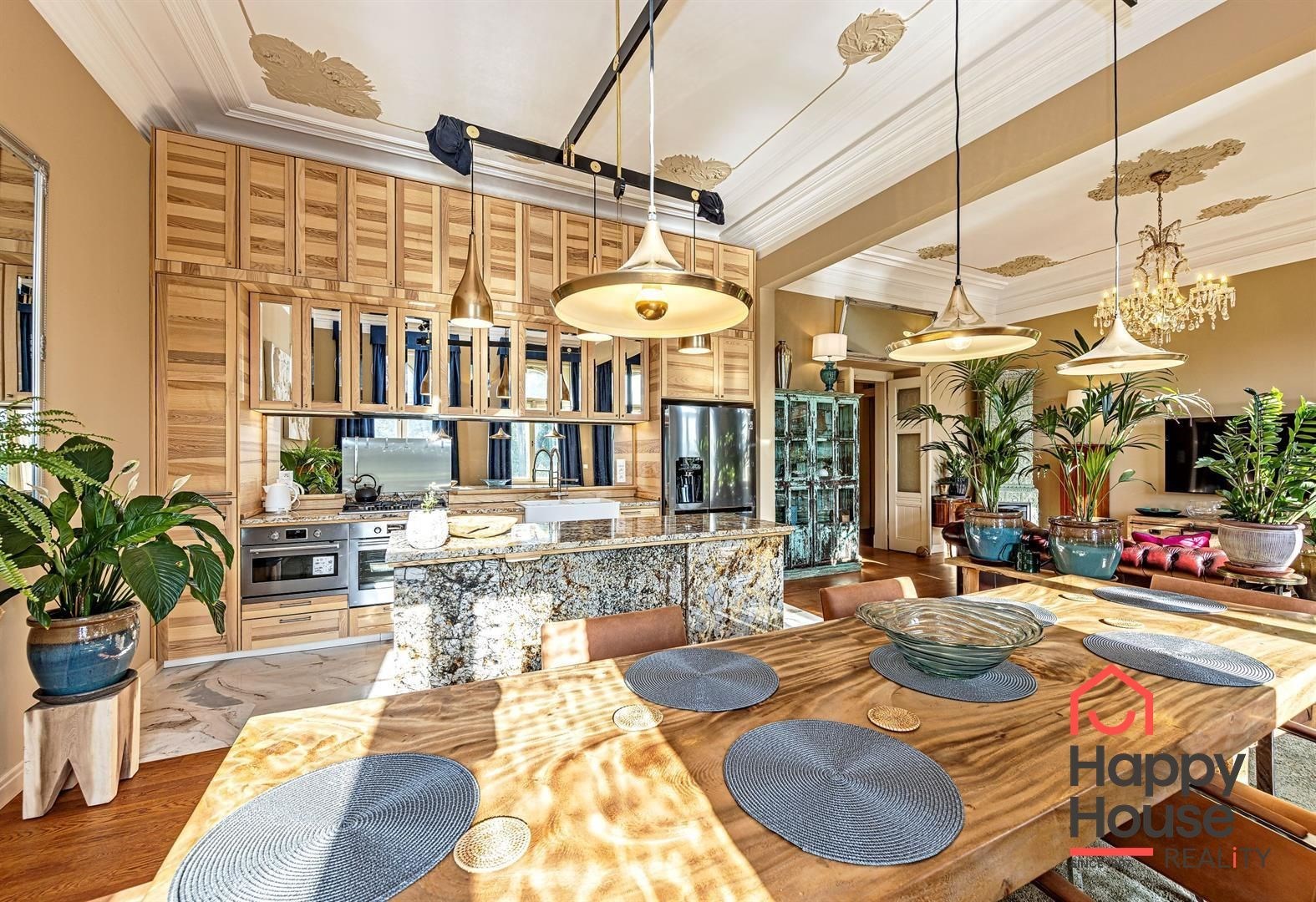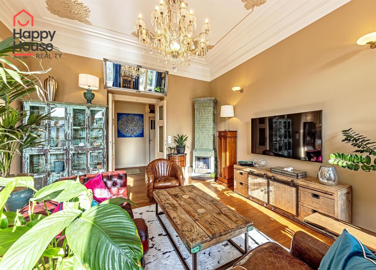 The apartment has undergone a complete renovation, focusing on the quality of workmanship and the use of above-standard materials. The highlight of the interior is a spacious living room with functional fireplace stoves, which connects to a fully equipped kitchen - American fridge with freezer, gas hob, electric oven, and wine cooler.