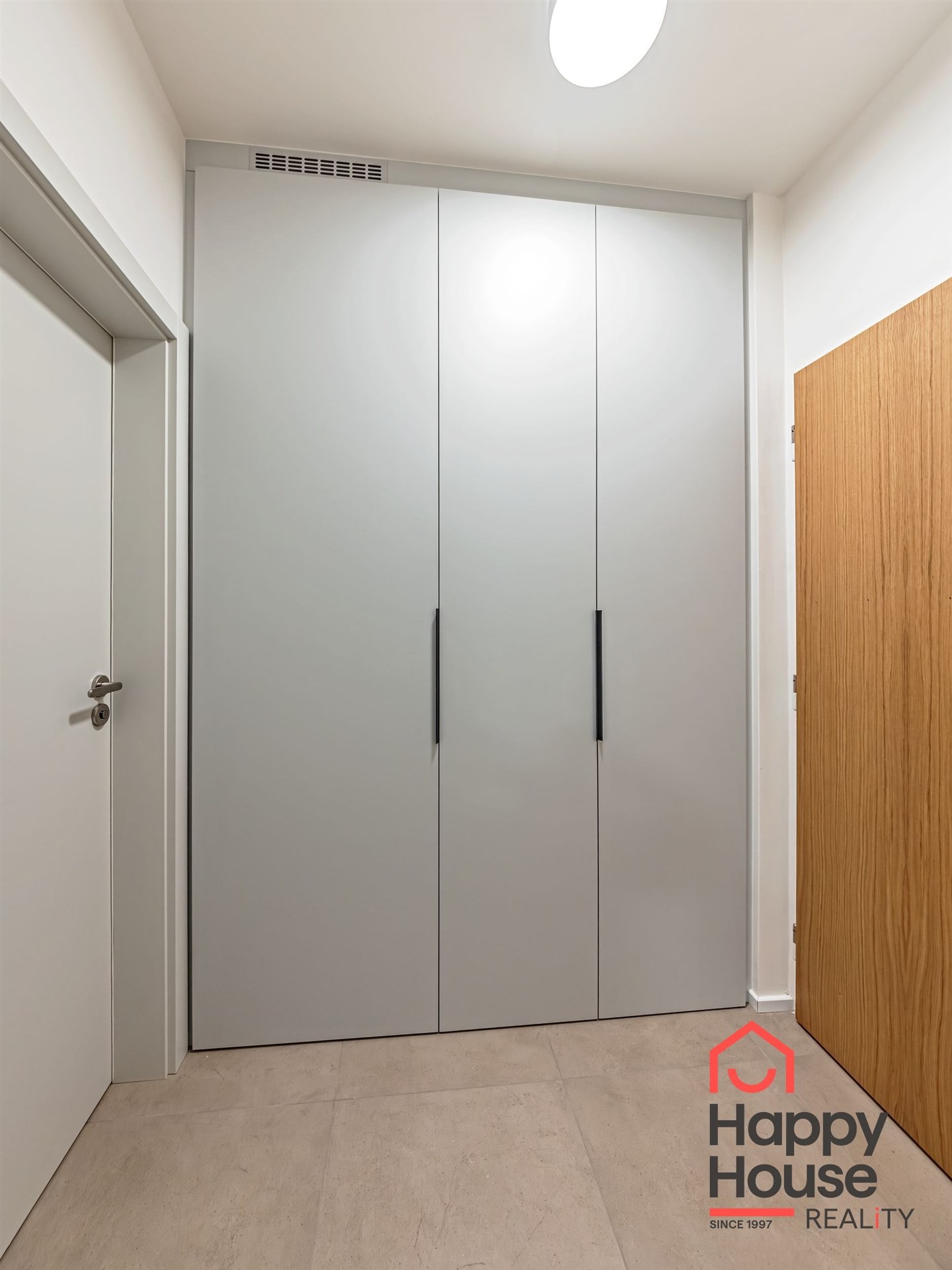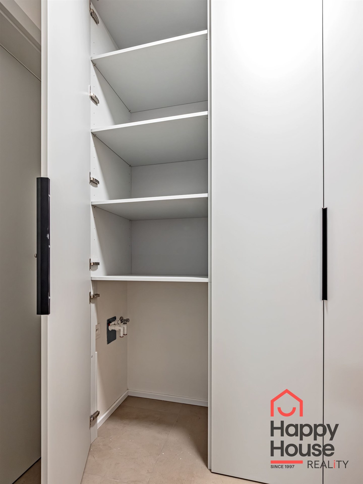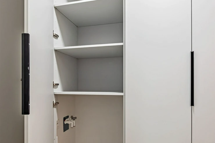 In the entryway, there are large built-in wardrobes, which include preparations for a washing machine.