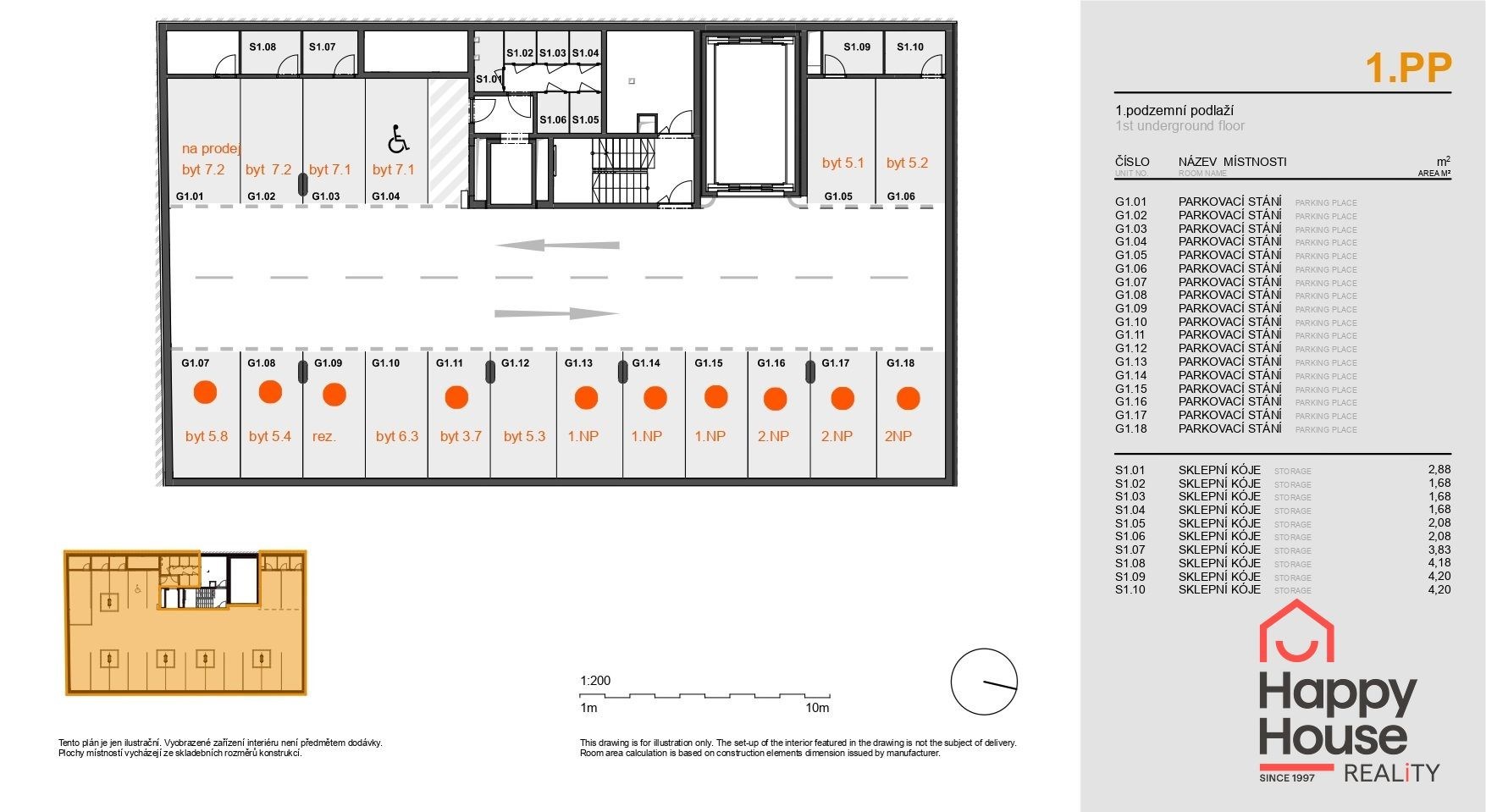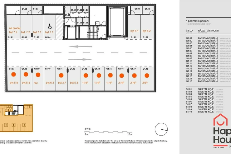 A garage parking space can be rented for 3,000 CZK per month and a storage cellar for 1,500 CZK per month.