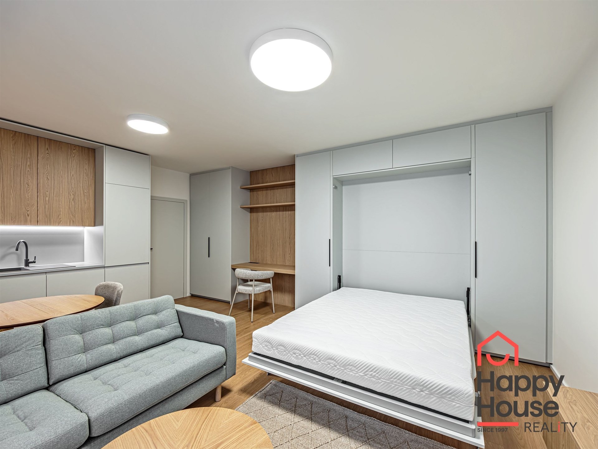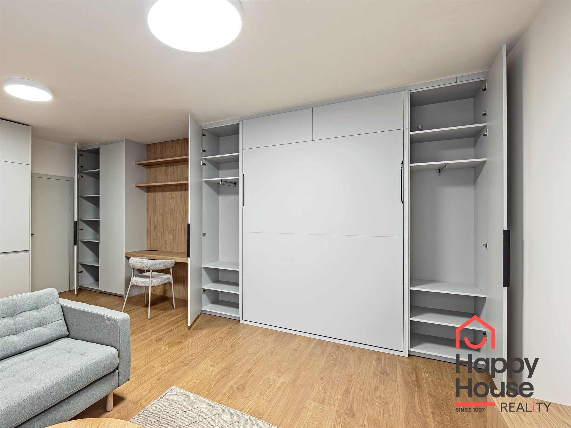 In the living area, there is a sofa, a coffee table, and a TV stand. Also included are built-in wardrobes, a writing desk, and a chair.