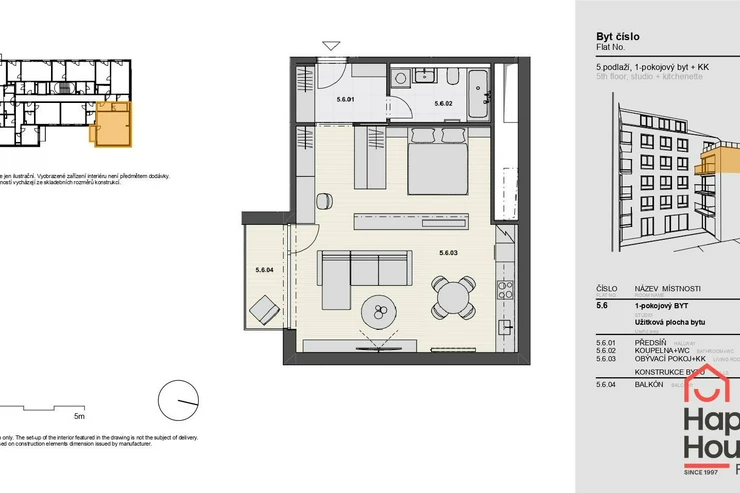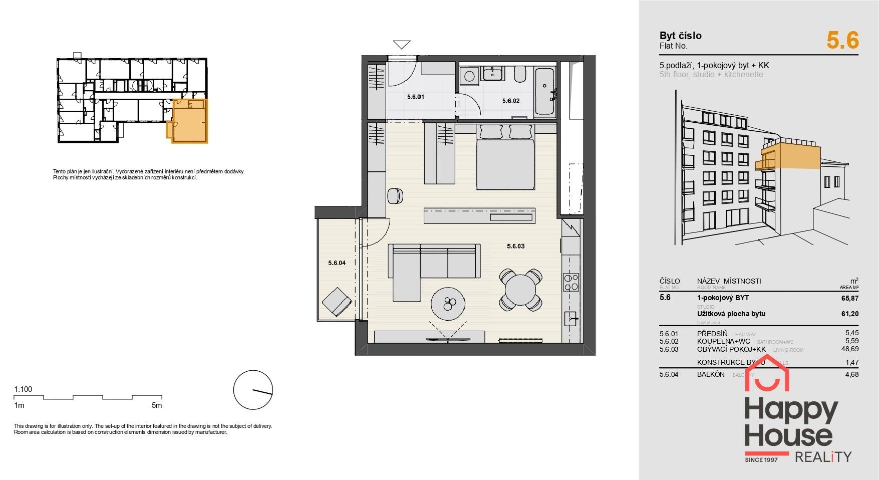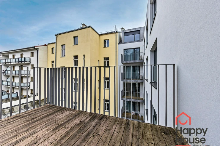 Rental of a furnished 1+kk apartment (61sqm) on the 5th floor with a balcony (5sqm) in the multifunctional building Vítkovia center, Prague 3 - Žižkov, Pod Vítkovem street.