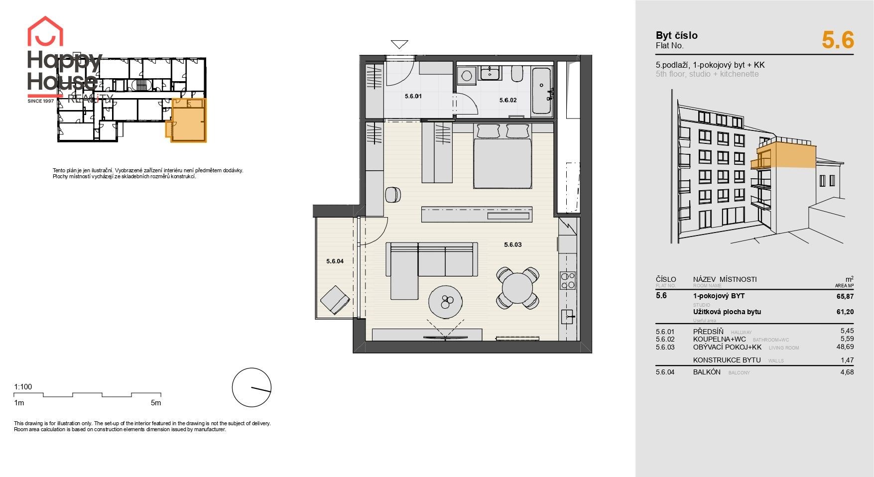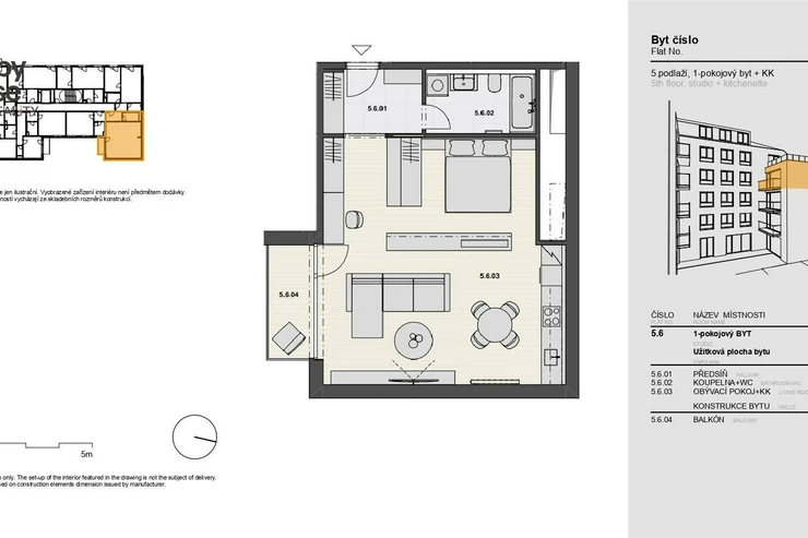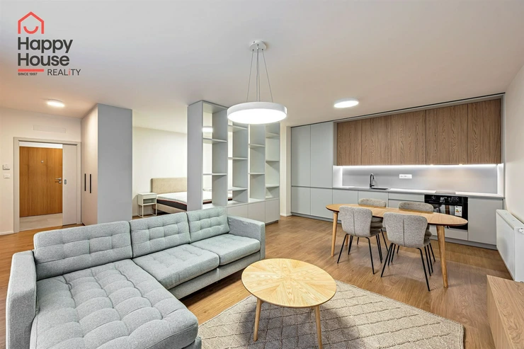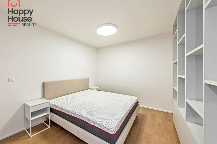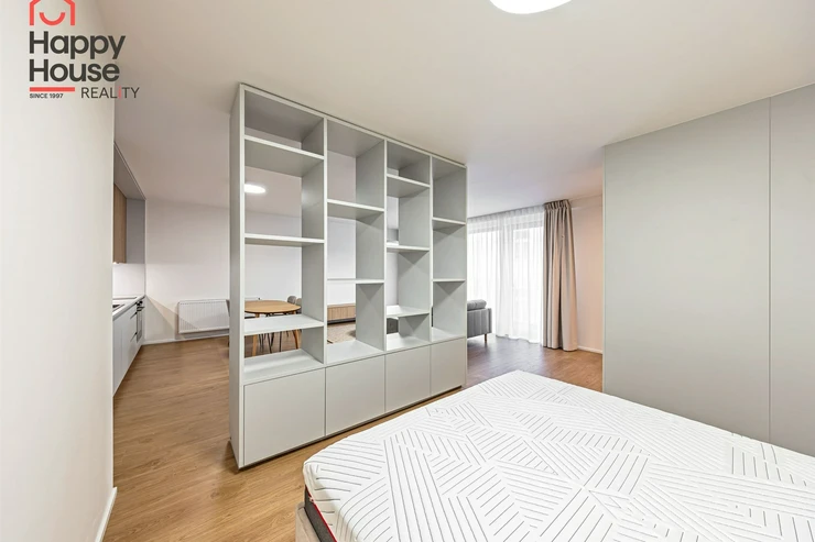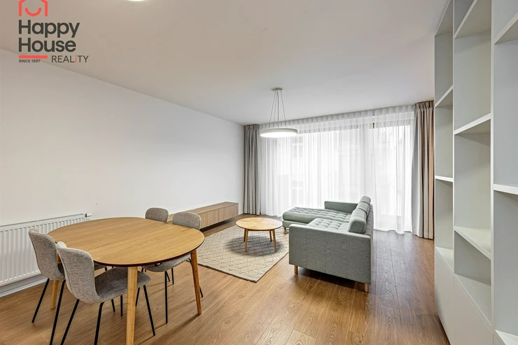 Offering for rent a newly furnished 1+kk apartment (61sqm) on the 5th floor with a balcony (5sqm) and cellar in the multifunctional building Vitkovia Center, Prague 3 - Žižkov, Pod Vítkovem Street.
